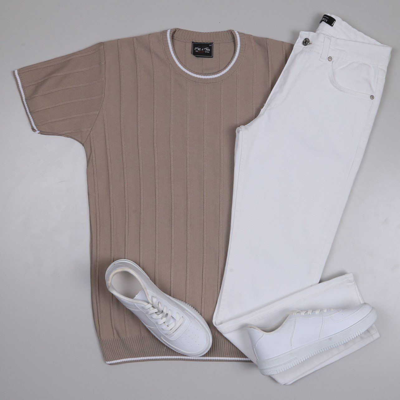 bej bisiklet yaka Triko Polo Yaka Tişört beyaz kot pantolon ayakkabı Kombin