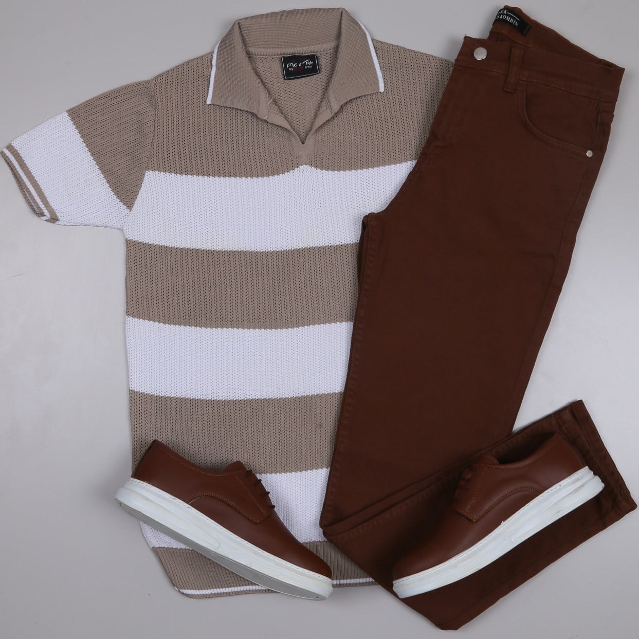 bej çizgili Triko Polo Yaka Tişört kahve  kot  pantolon  ayakkabı Kombin