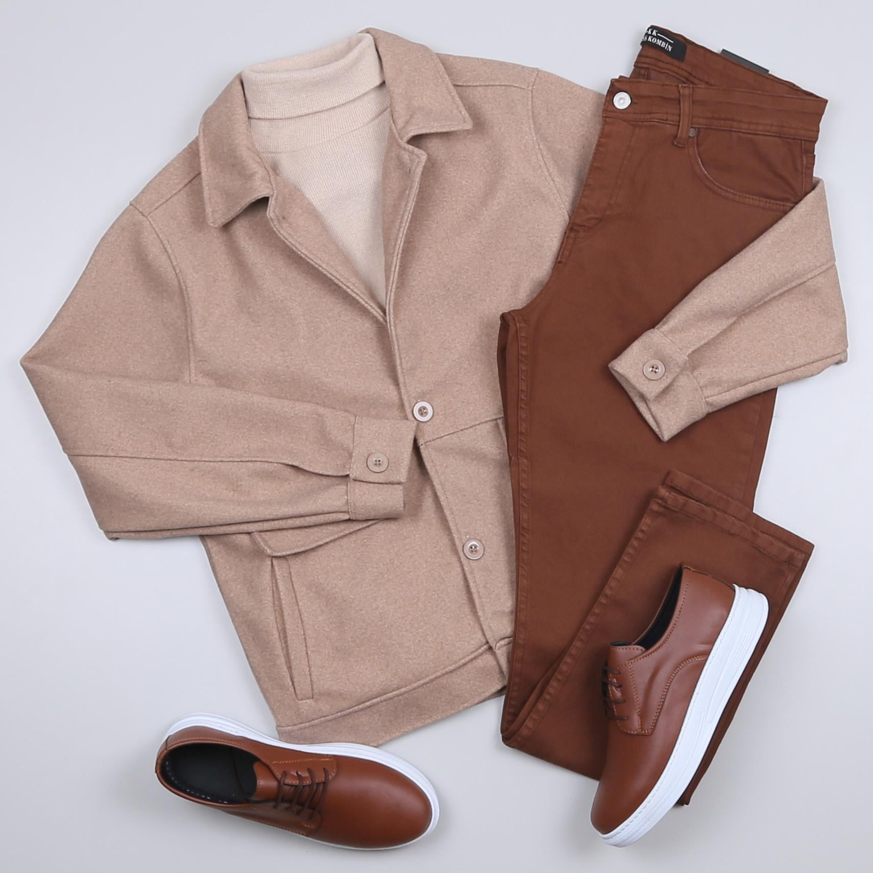 Bej Kaşe Ceket Boğazlı Body Kot Pantolon Ayakkabı Kombini