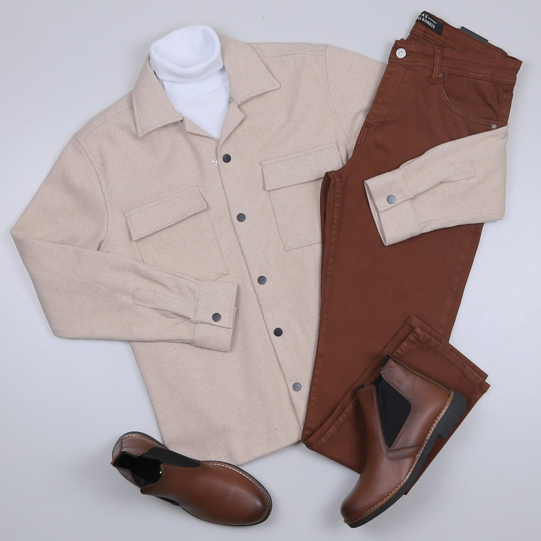 Bej Kaşe Gömlek Boğazlı Body Pantolon Bot Kombin