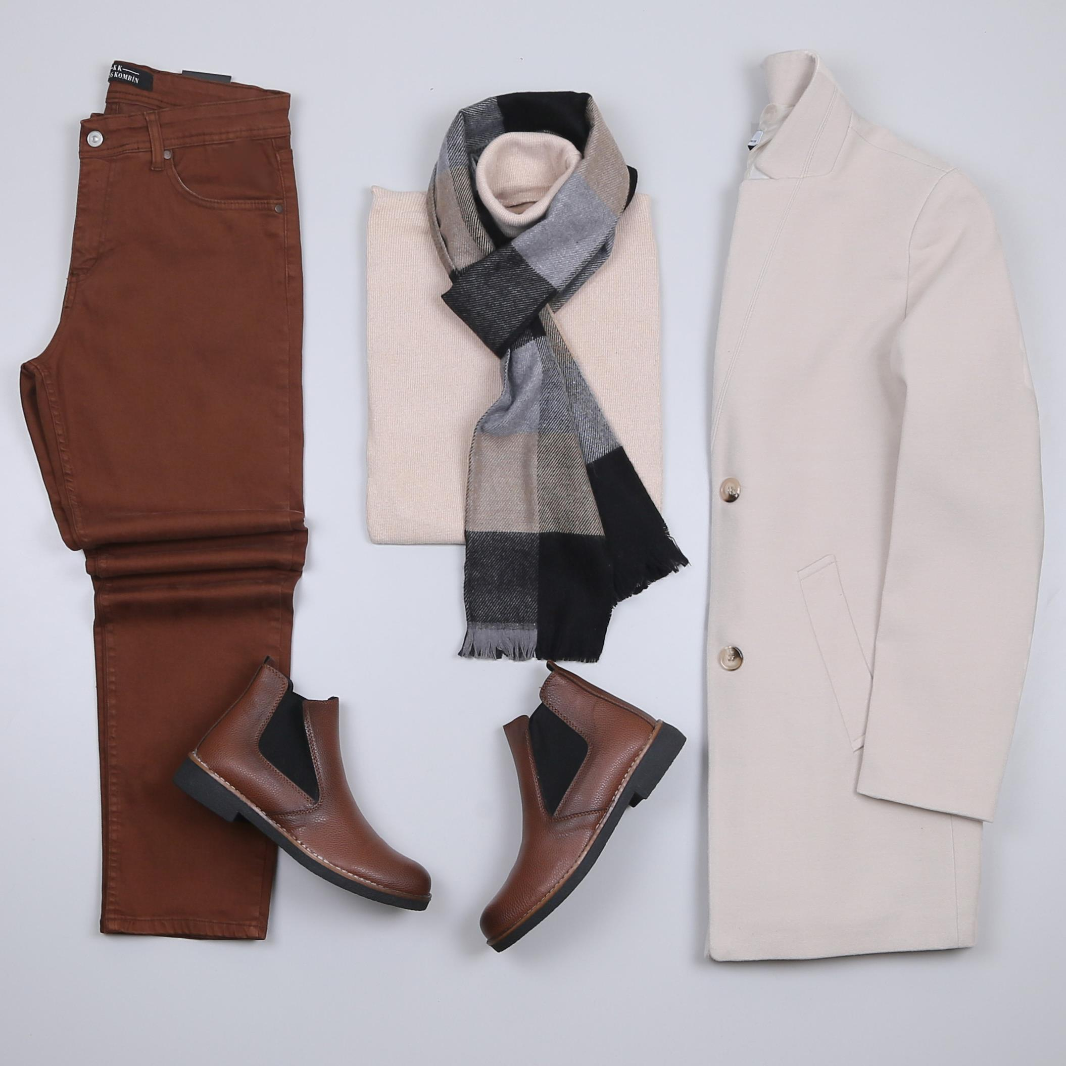 Bej Kaşe Kaban Boğazlı Body Kot Pantolon Bot Kombini