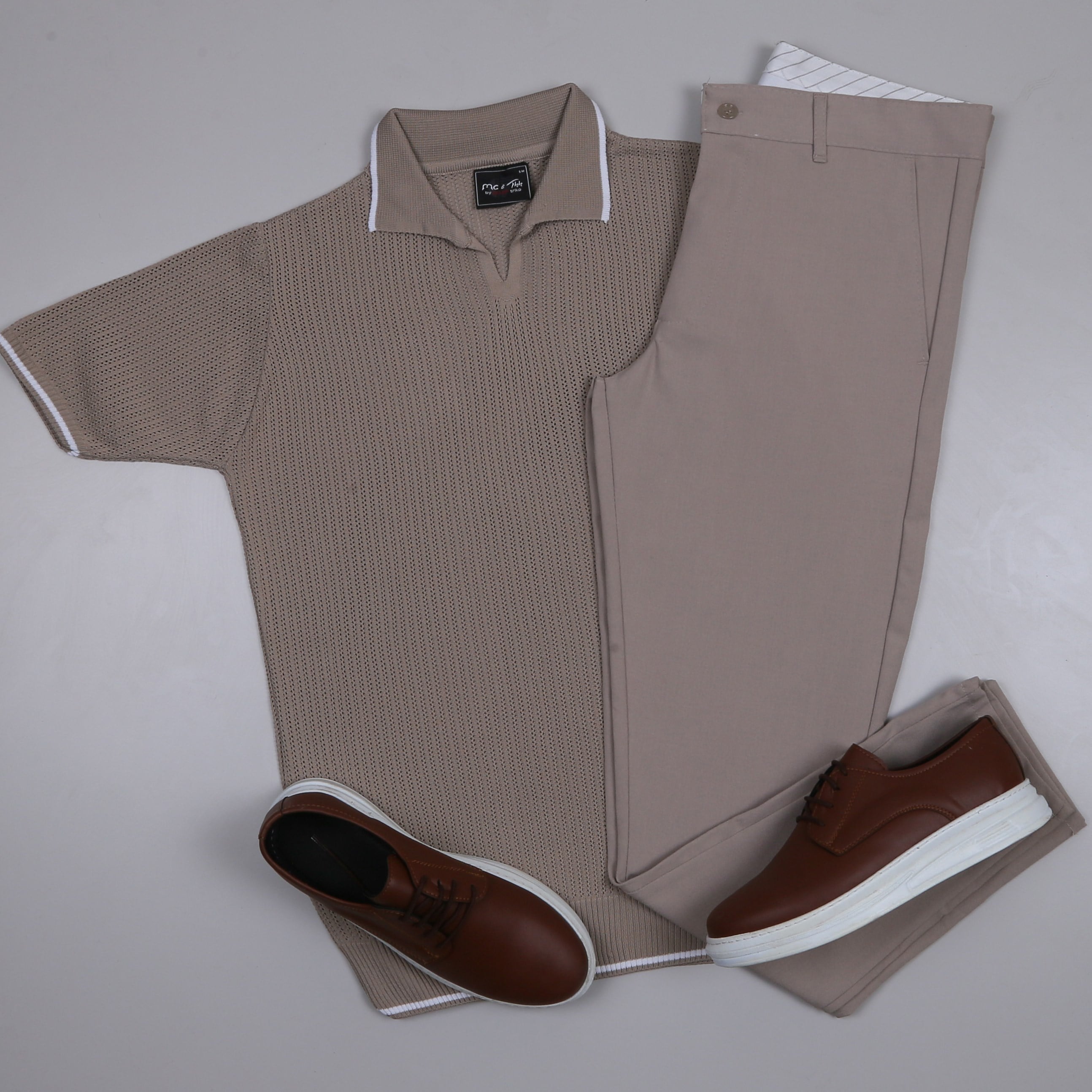 bej Triko Polo Yaka Tişört bej kumaş pantolon ayakkabı Kombin