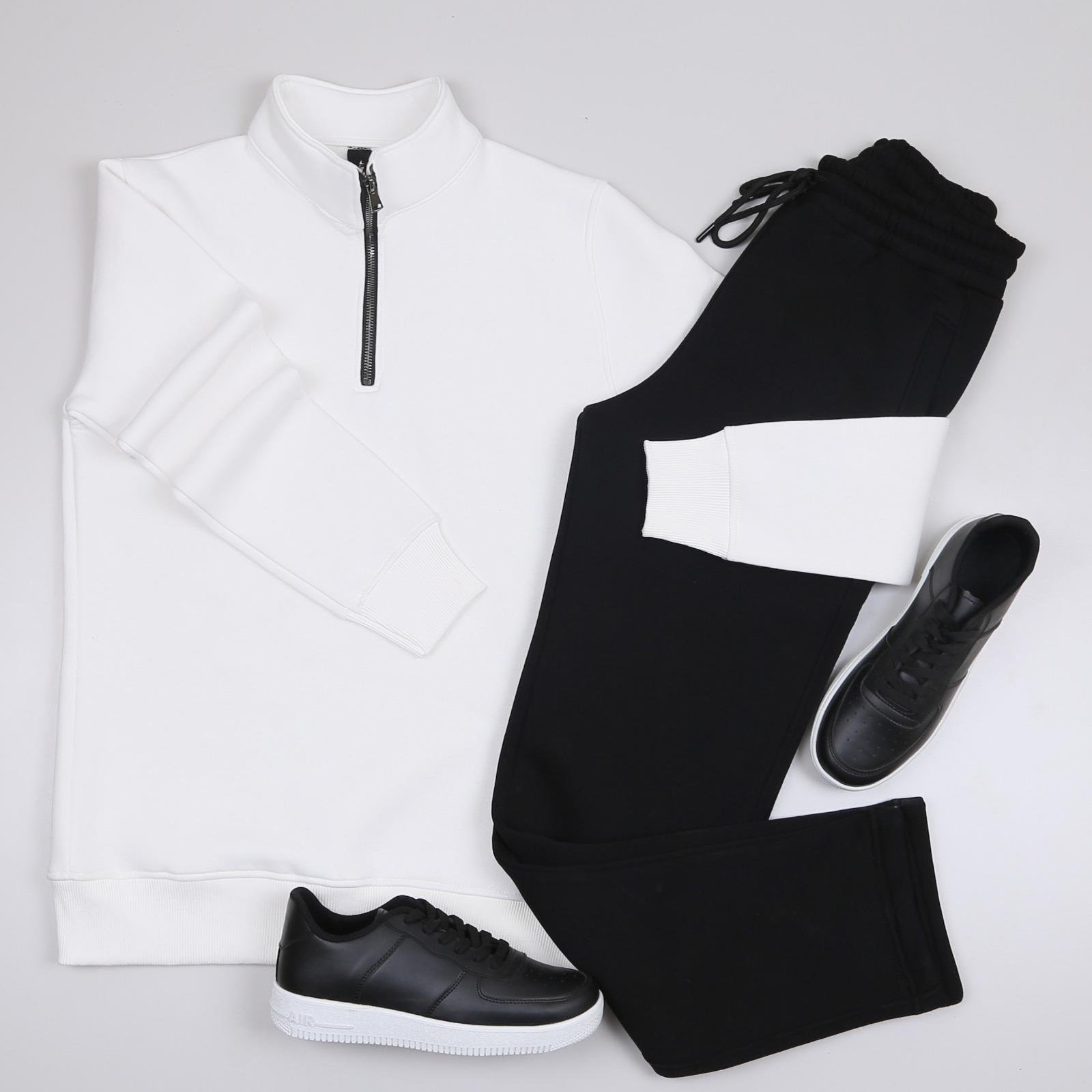 Beyaz Dik Yaka Sweatshirt Siyah Eşofman Ayakkabı  Kombini