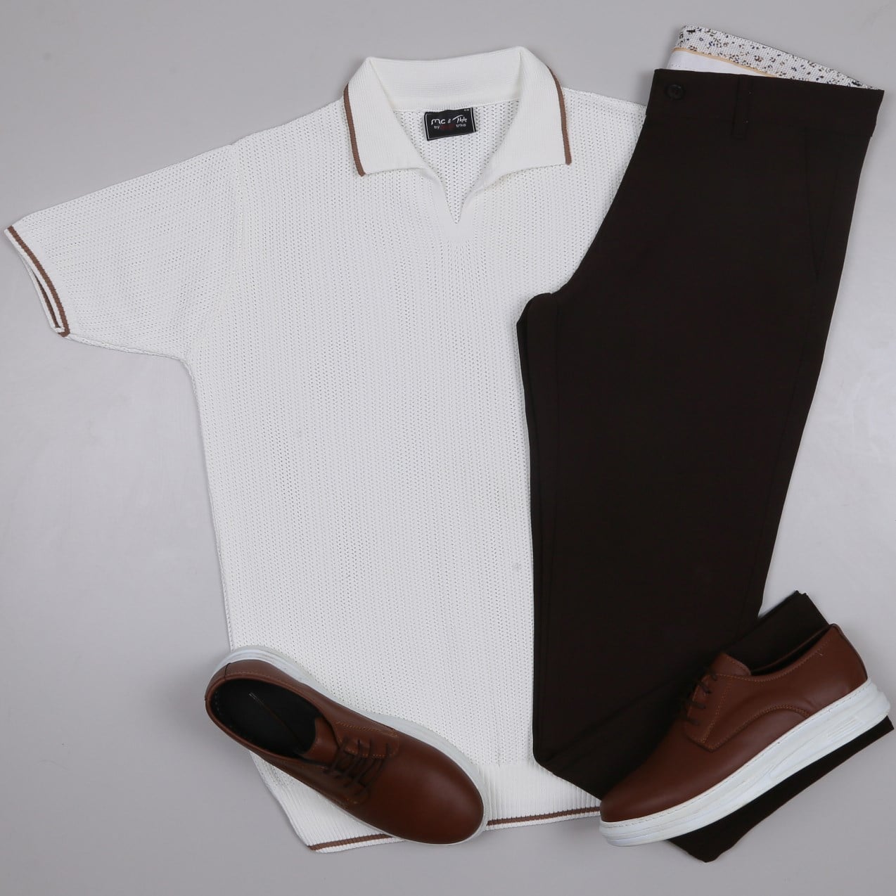 beyaz Triko Polo Yaka Tişört kahve kumaş pantolon  ayakkabı Kombin