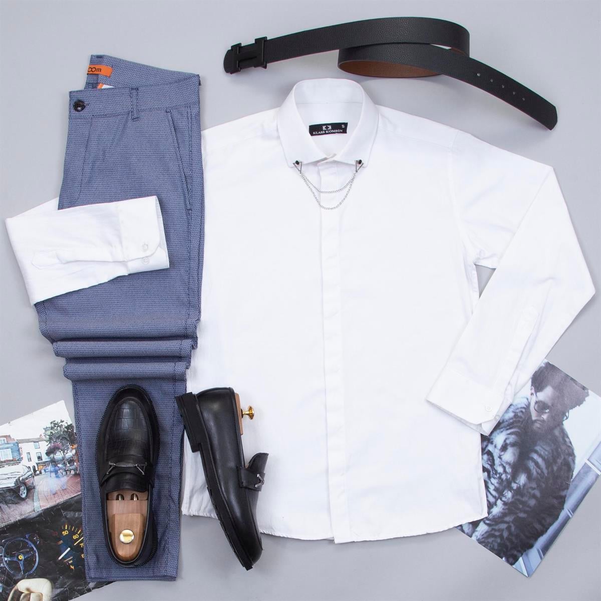 Armürlü Mavi Pantolon Beyaz Gömlek Ayakkabı Kombin