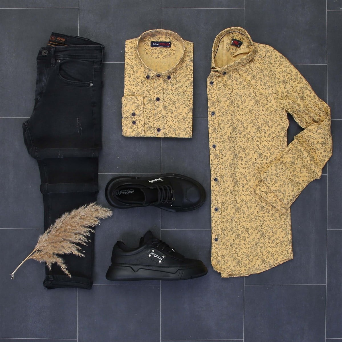 Hardal Gömlek Siyah Kot Pantolon Ayakkabı Kombini