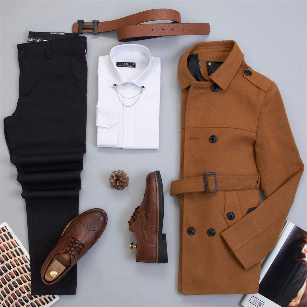 Kemerli Taba Kaşe Kaban Gömlek Ayakkabı Kombin
