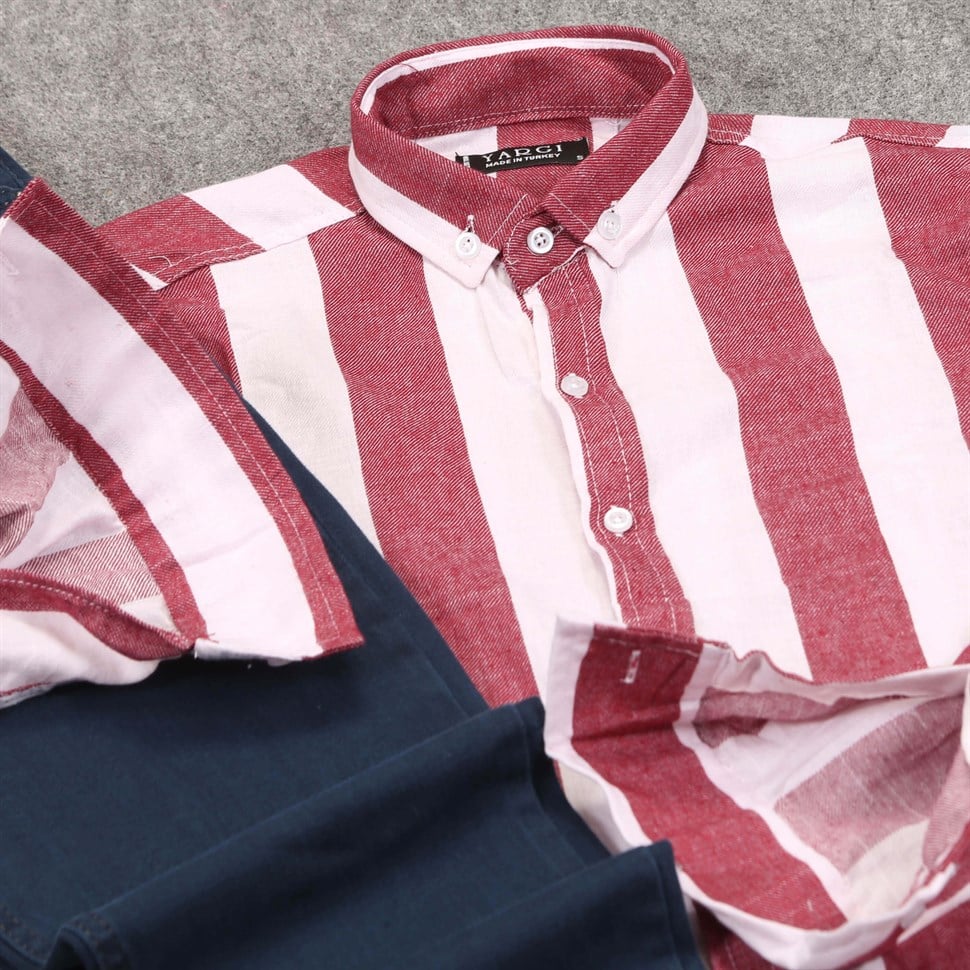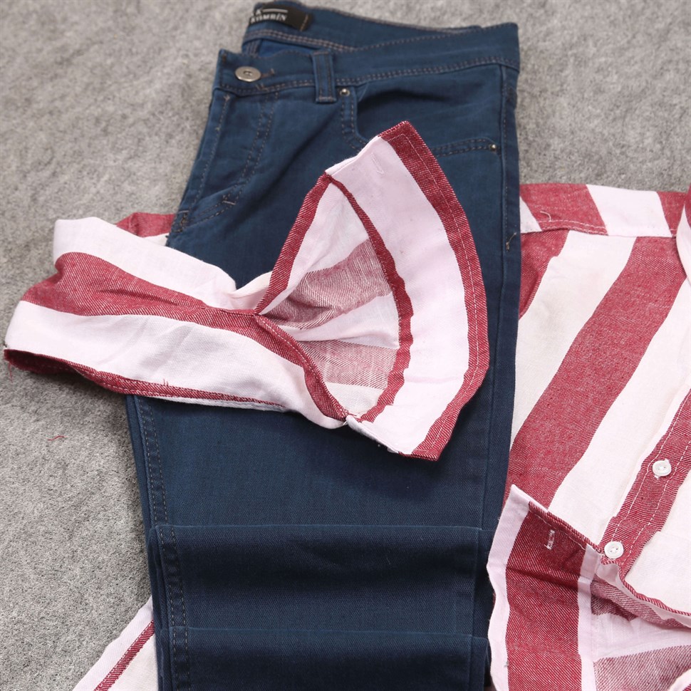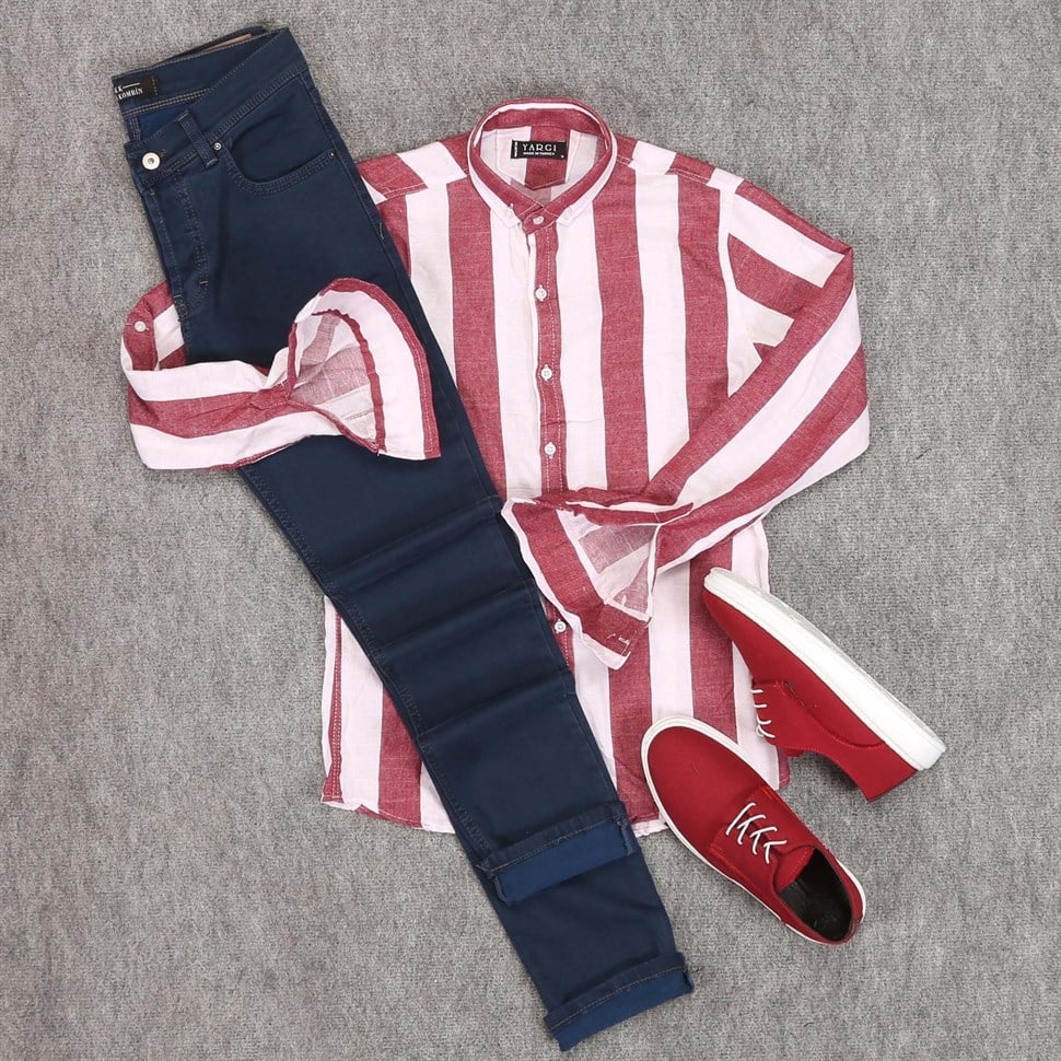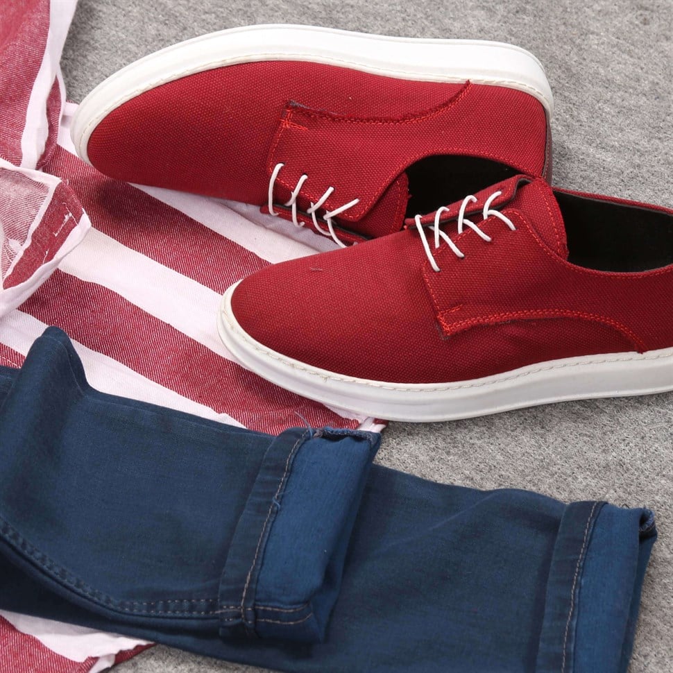 Mavi Kot Kırmızı Gömlek Ayakkabı Kombini