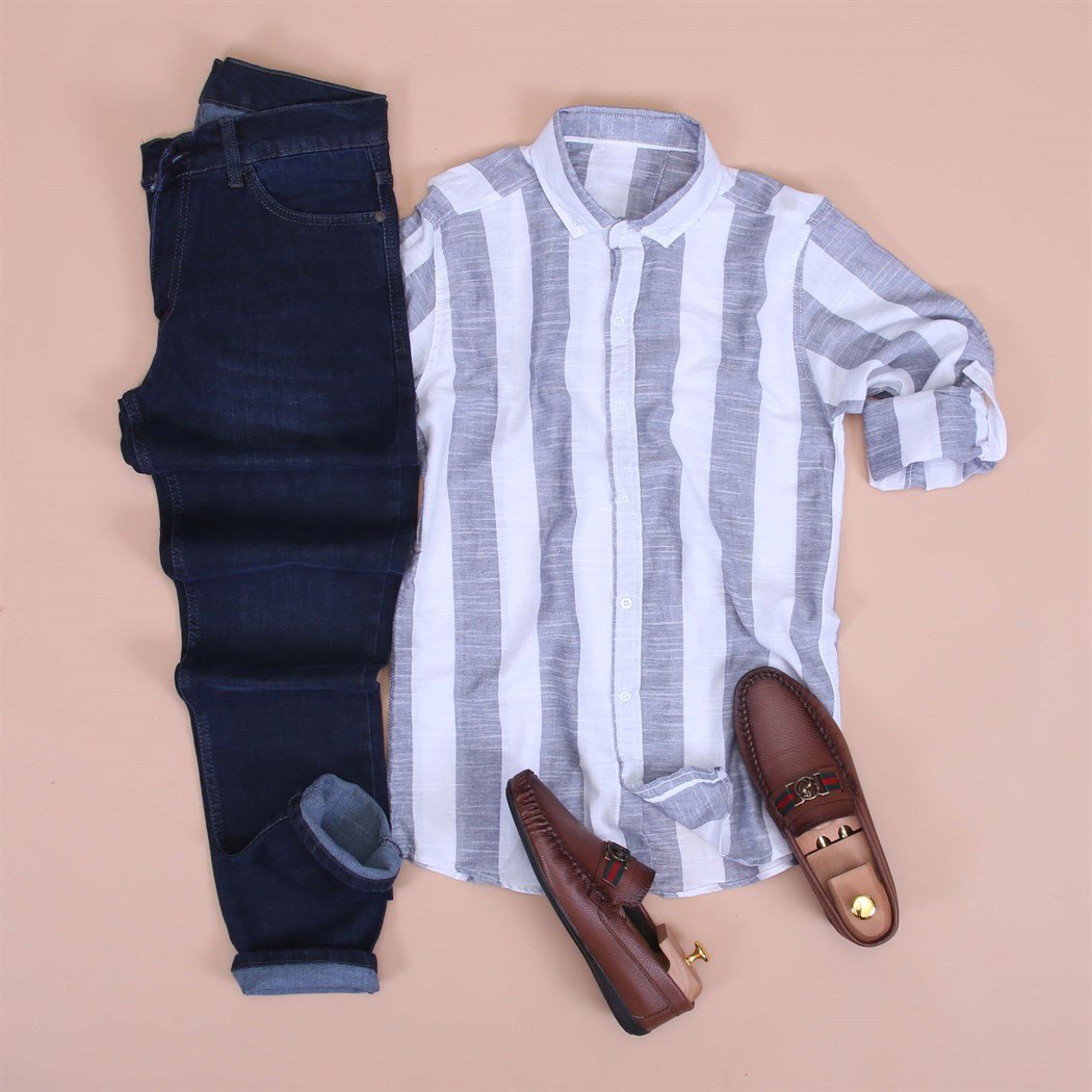 Yeni Sezon Çizgili Gömlek Lacivert Kot Pantolon Kahverengi  Ayakkabı