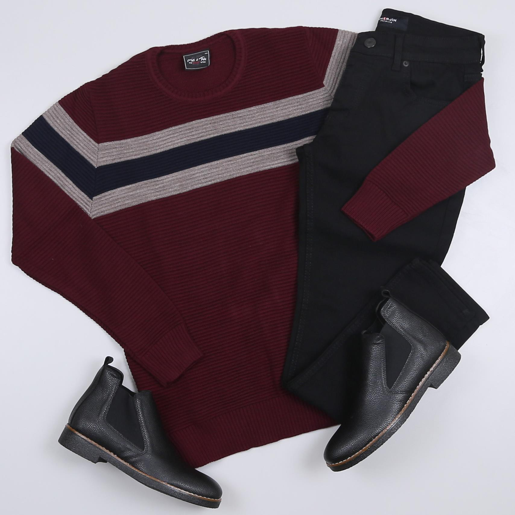 Bordo Çizgili Kazak Kot Pantolon Bot Kombini