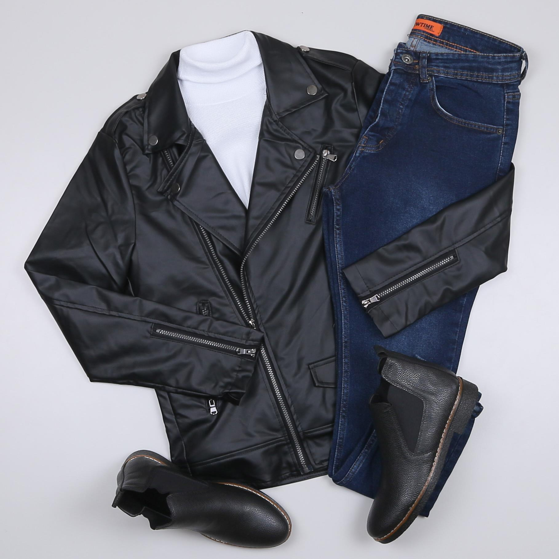 Çapraz Fermuarlı Siyah Deri Ceket Boğazlı Body Pantolon Bot Kombin