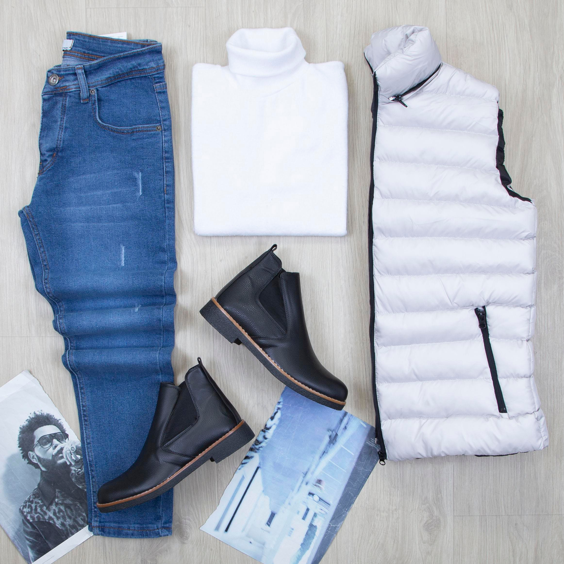 Çıkarılabilir Kapşonlu Gri Şişme Yelek Boğazlı Body Pantolon Bot Kombin