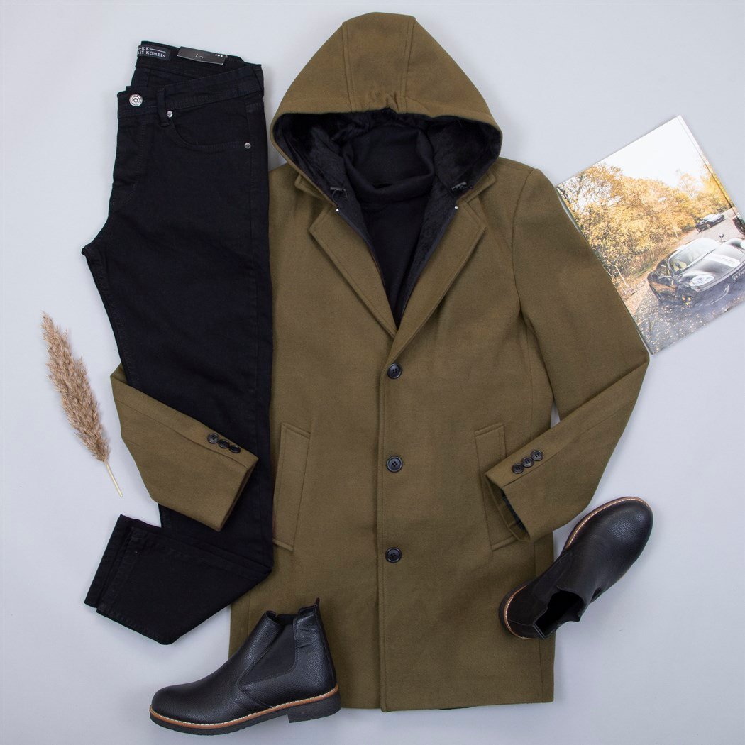 Çıkarılabilir Kapşonlu Kaşe Kaban Boğazlı Kazak Pantolon Bot Kombin