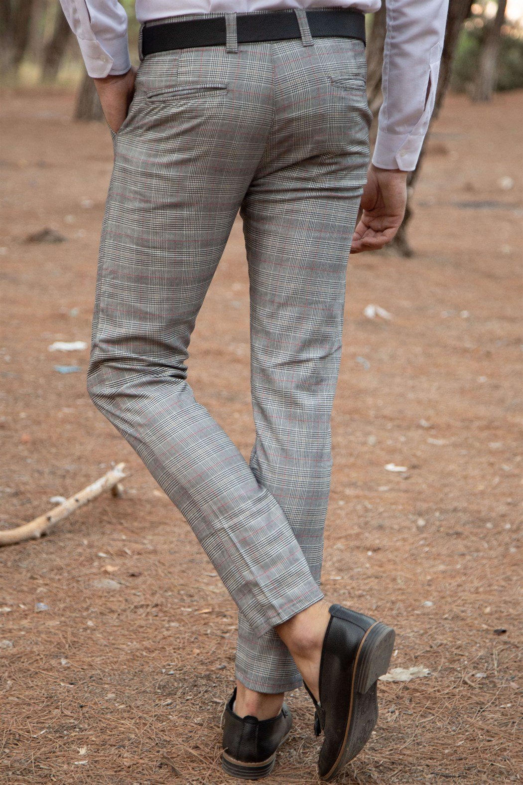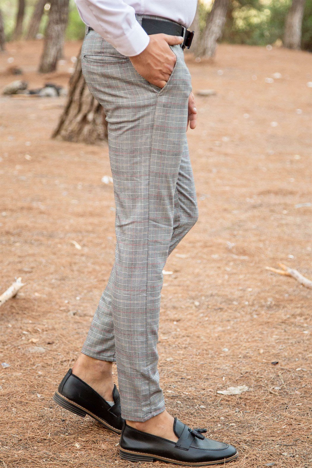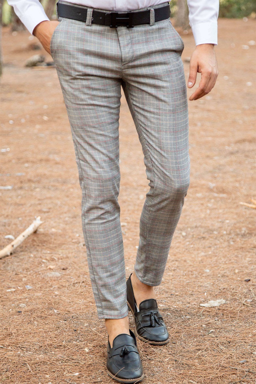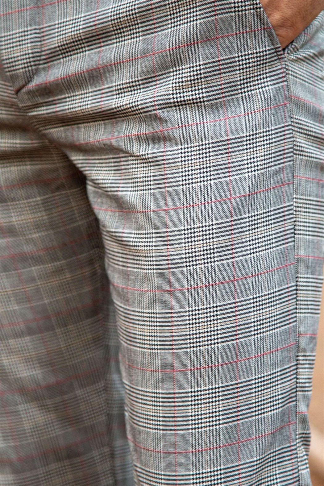 Slim fit gri üzeri kırmızı çizgili ekoseli kumaş pantolon
