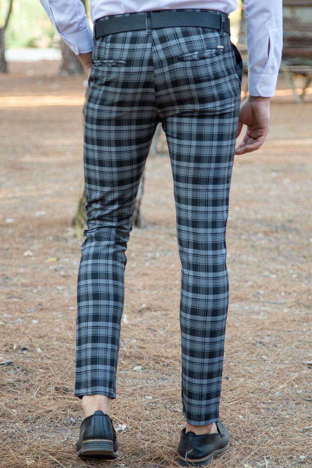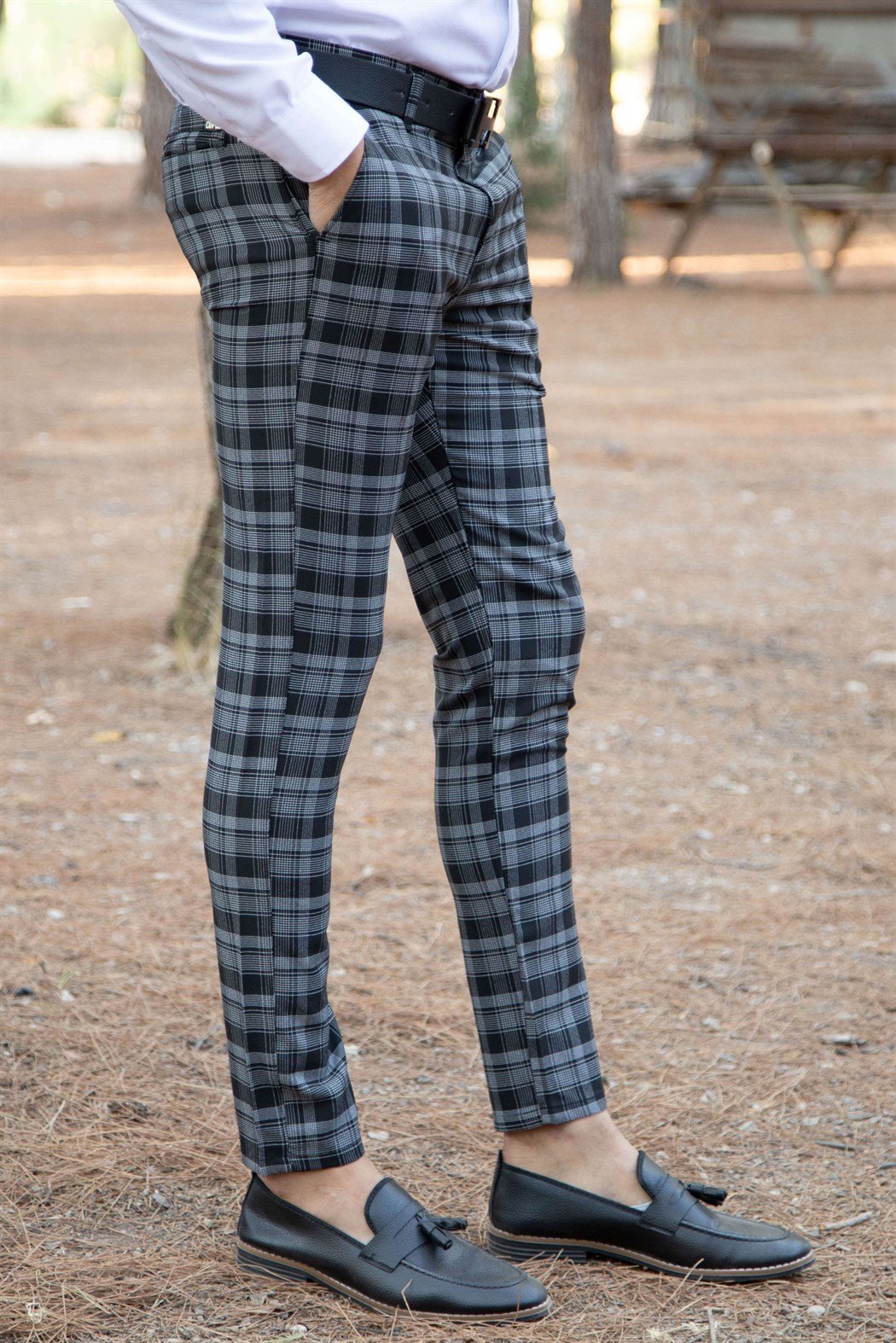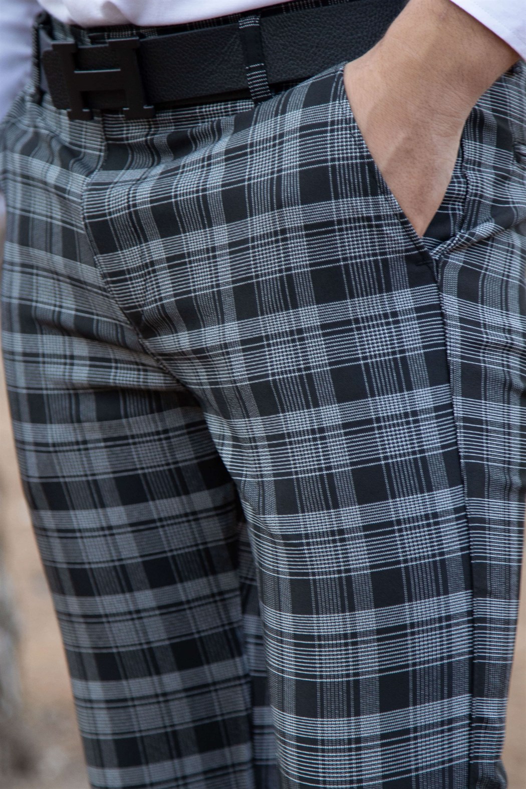Slim fit yan cep detaylı gri üzeri siyah ekoseli kumaş pantolon