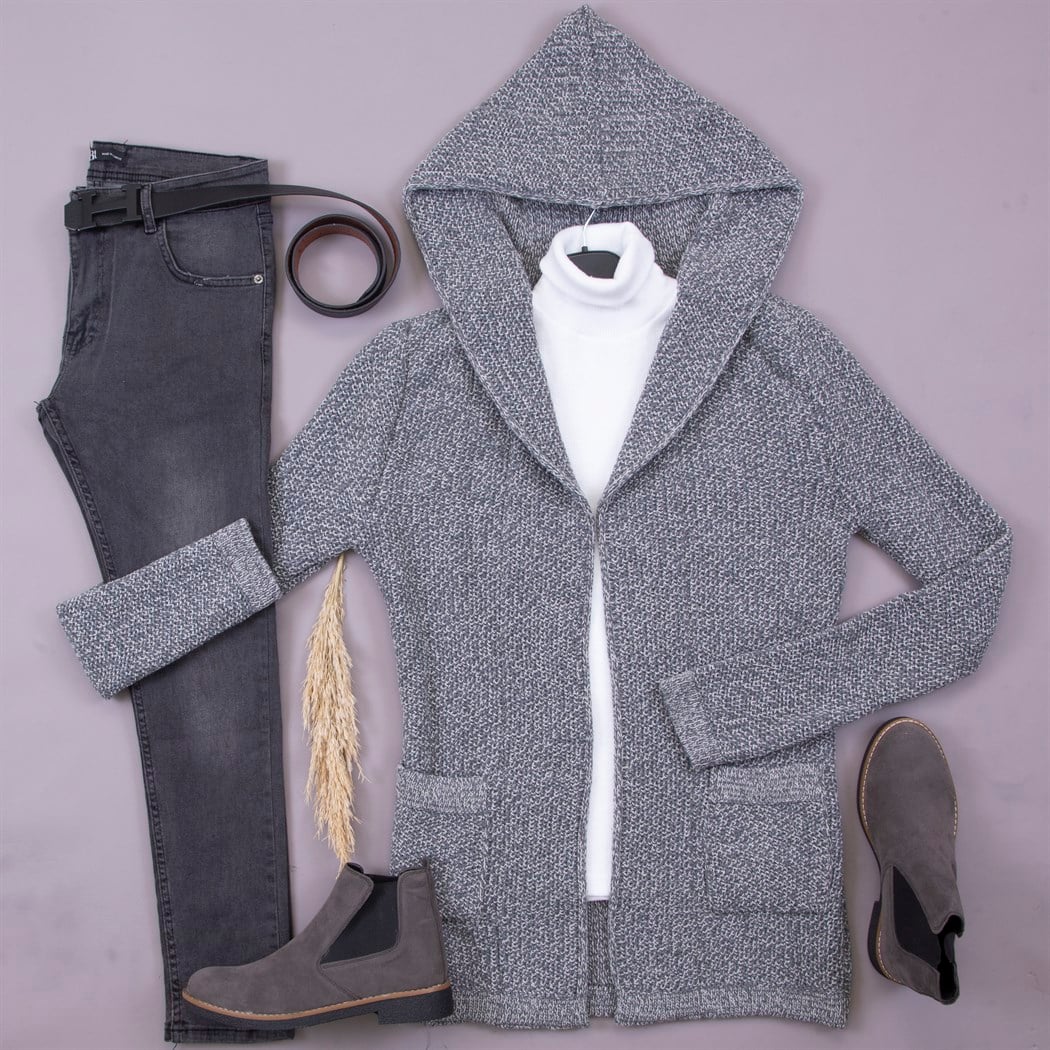 Kırçıllı Gri Beyaz Hırka Kazak Pantolon Bot Kombin