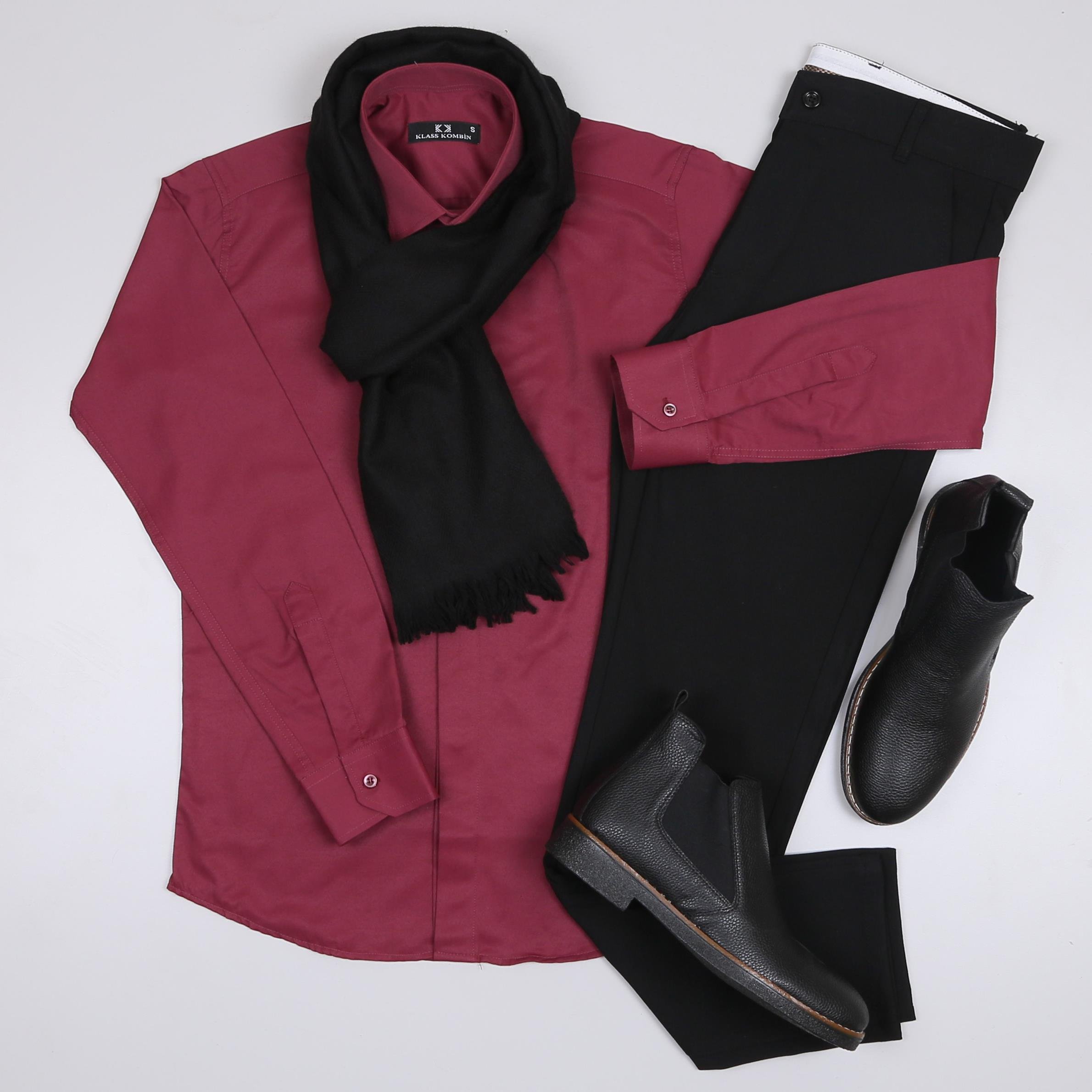 Bordo Gömlek Siyah Kumaş Pantolon Atkı Ayakkabı  Kombin