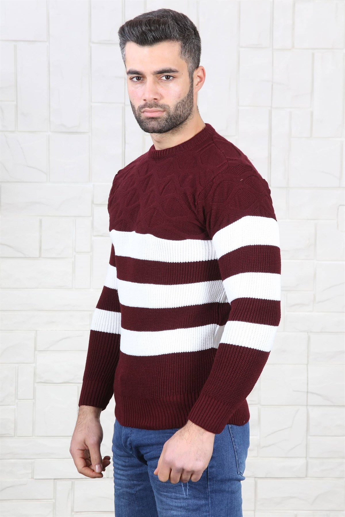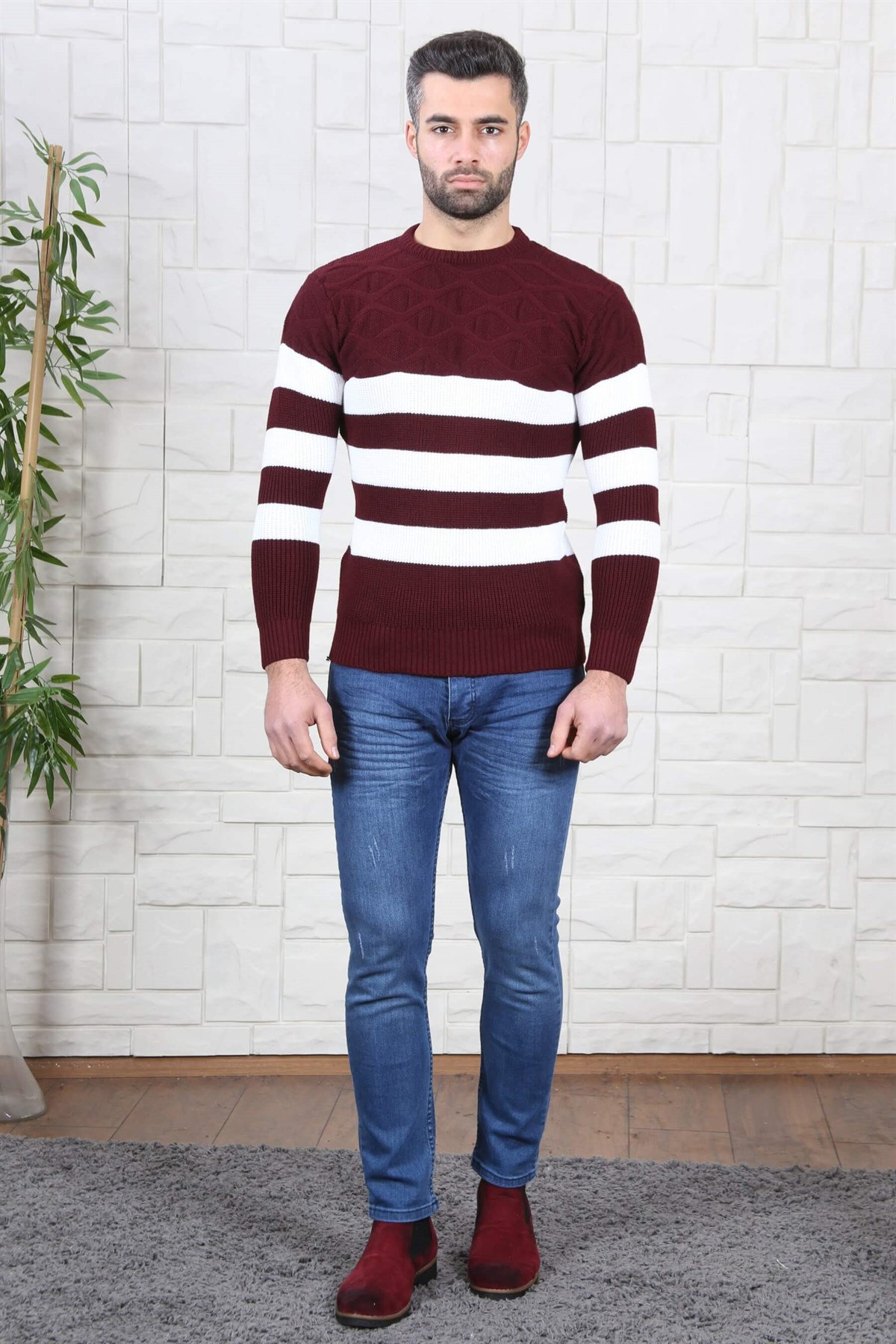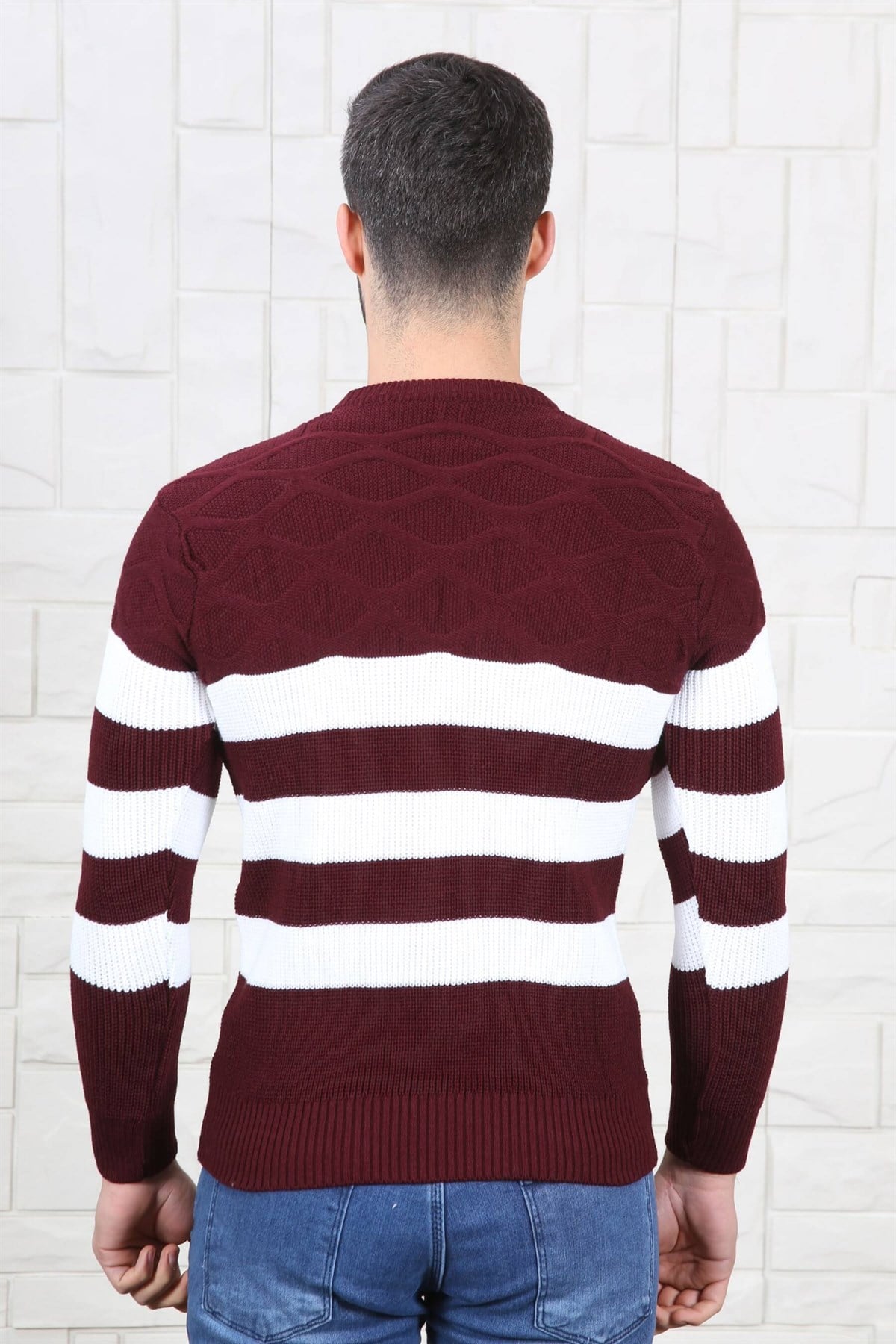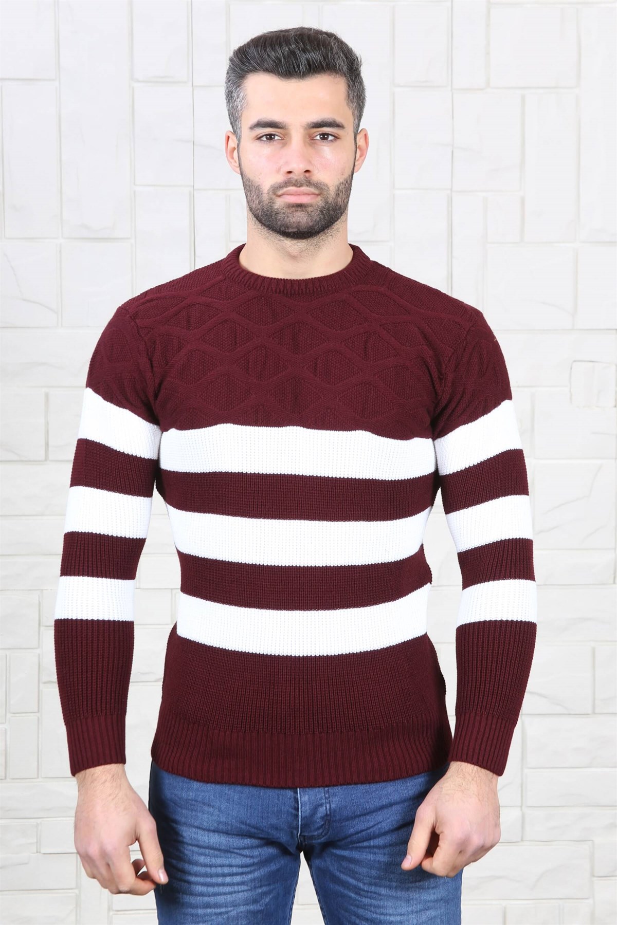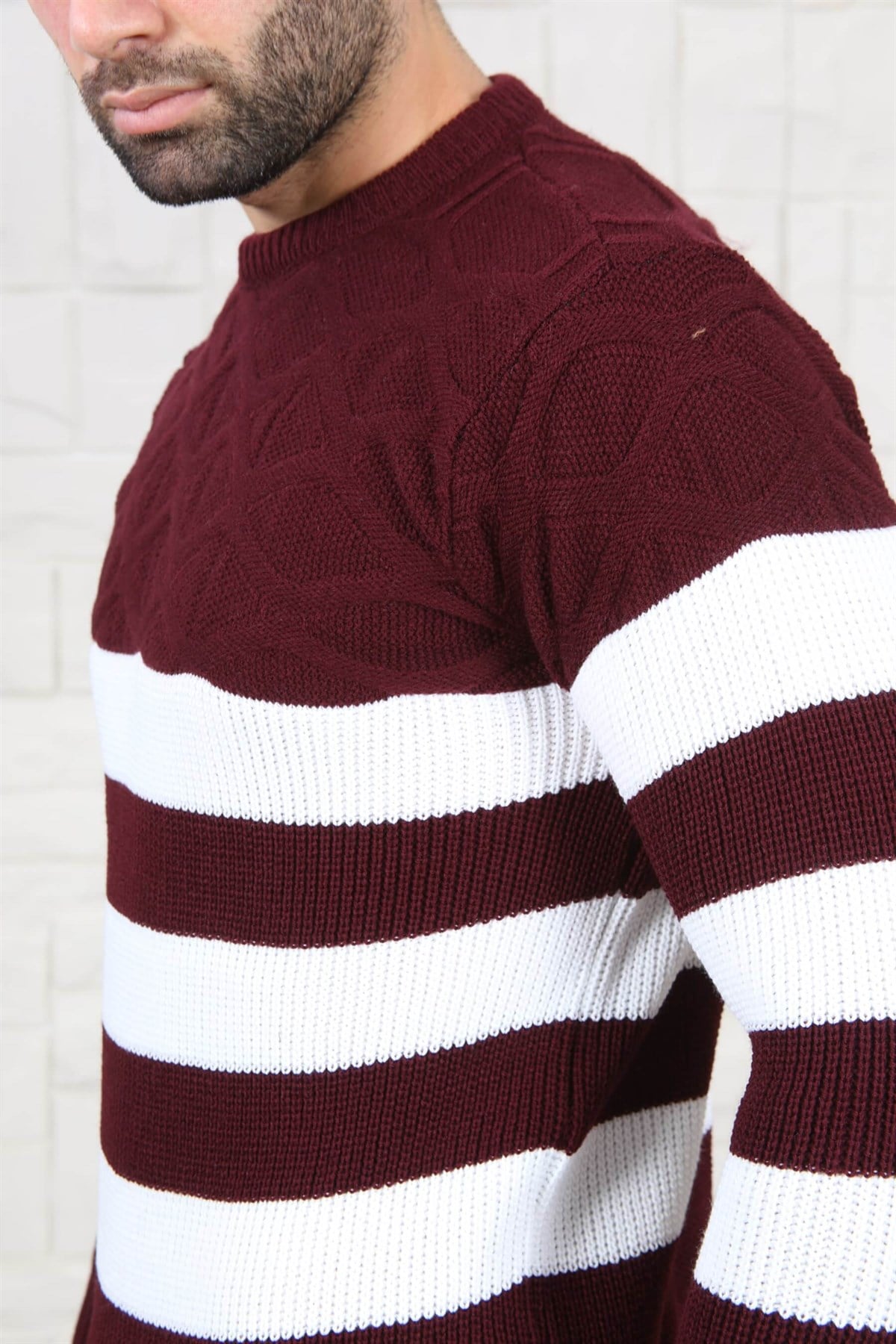 Slim Fit Bordo Beyaz Triko Kazak