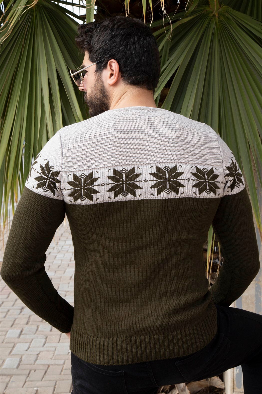 Haki Kar Desenli Bisiklet Yaka Kazak