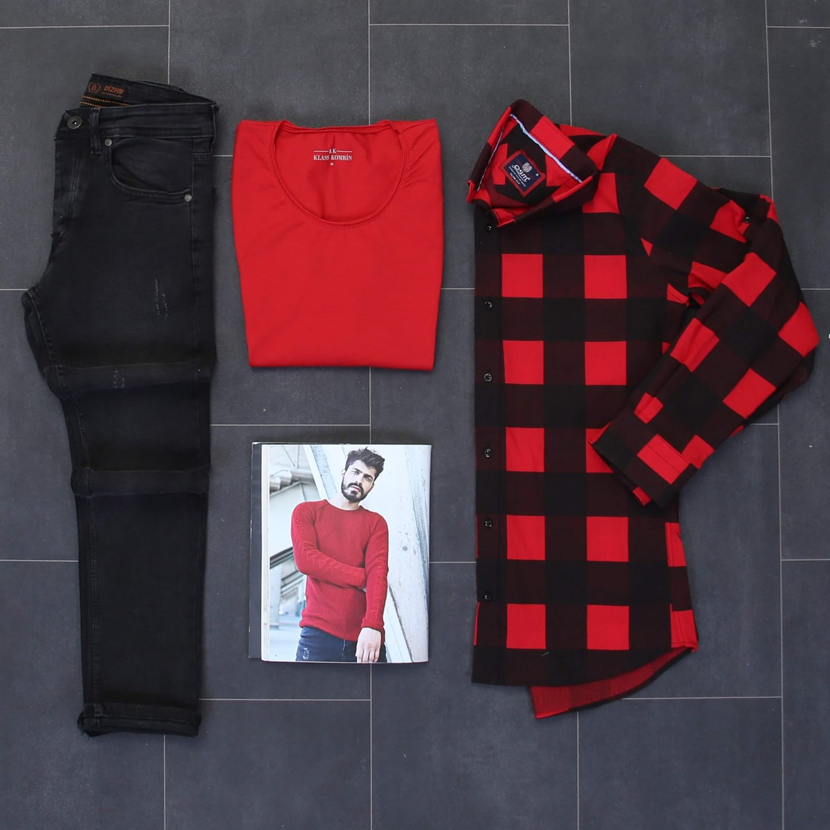 Kırmızı Gömlek T-Shirt Kot Kombini