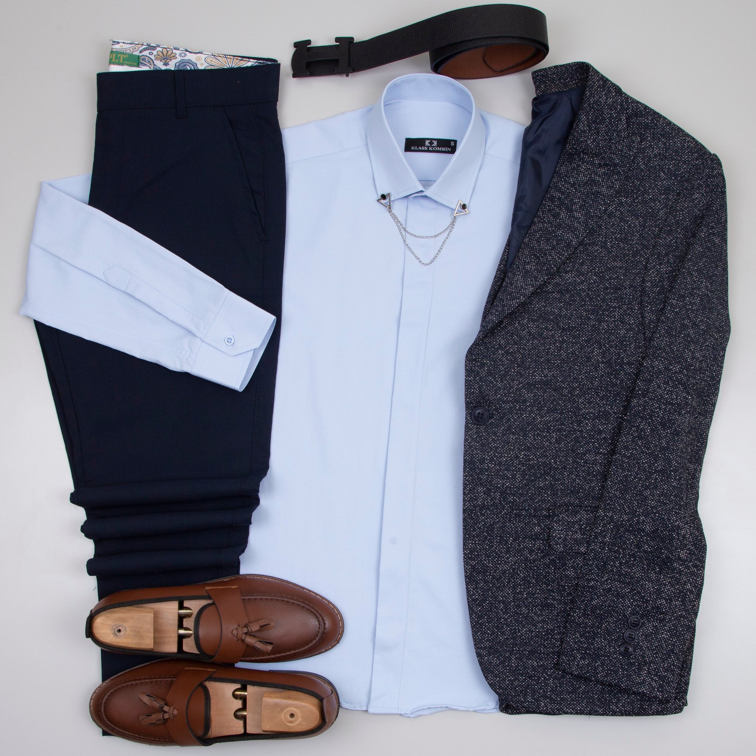 lacivert Kırçıllı  Blazer Ceket Mavi Gömlek Lacivert Pantolon  Ayakkabı Kombinİ
