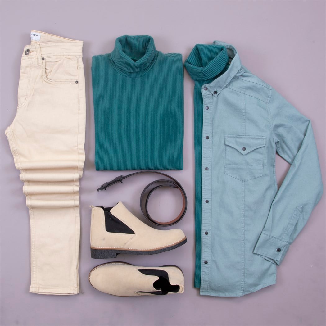 Mint Yeşili Gömlek Kazak Pantolon Bot Kombin