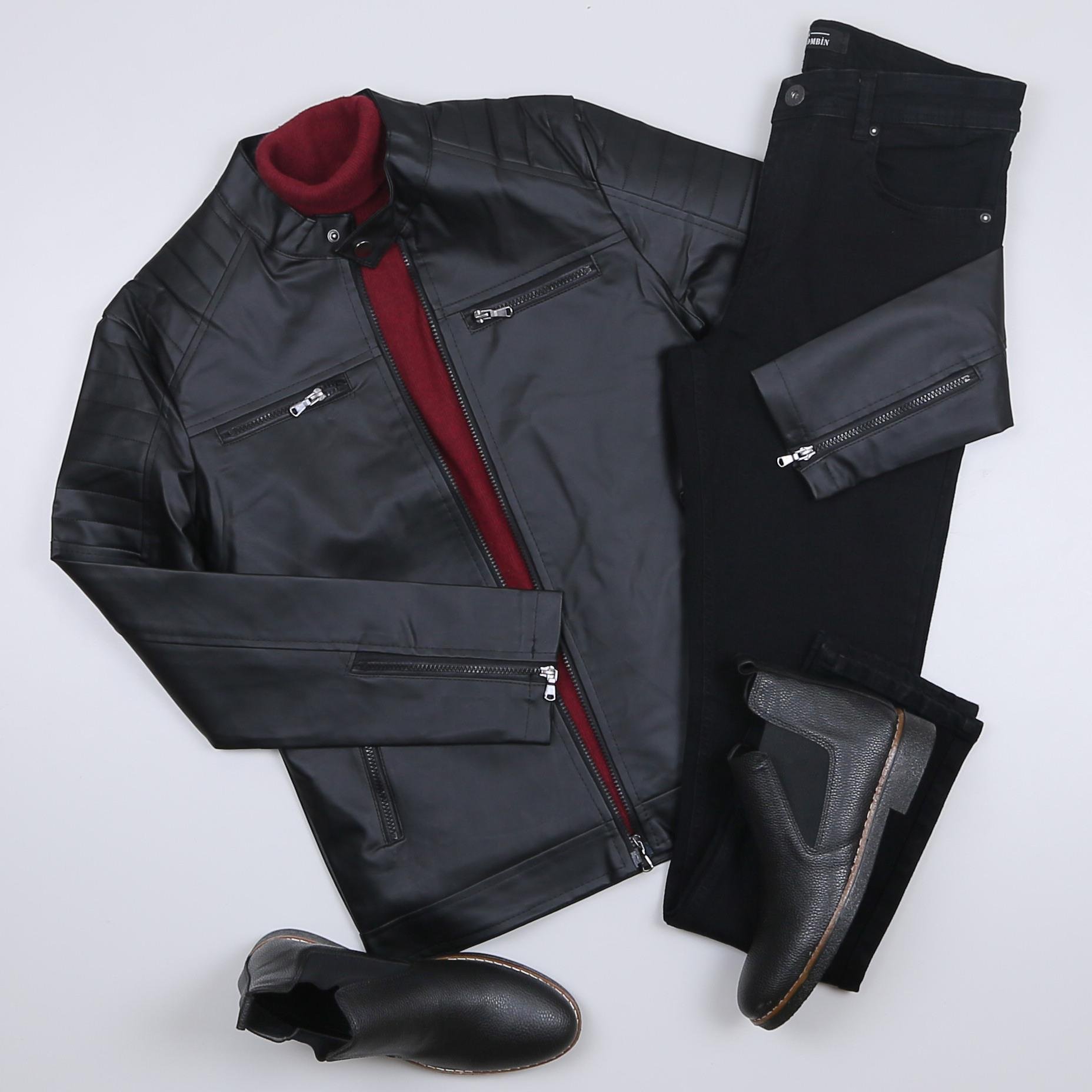 Siyah Deri Ceket Bordo Kazak Pantolon Bot Kombin