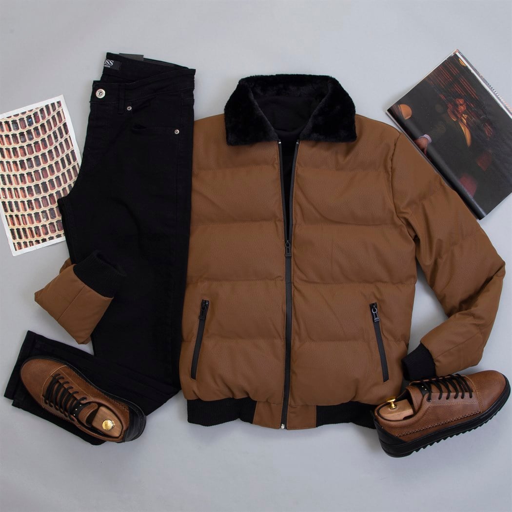Yakası Kürklü Taba Şişme Mont Kazak Pantolon Ayakkabı Kombin