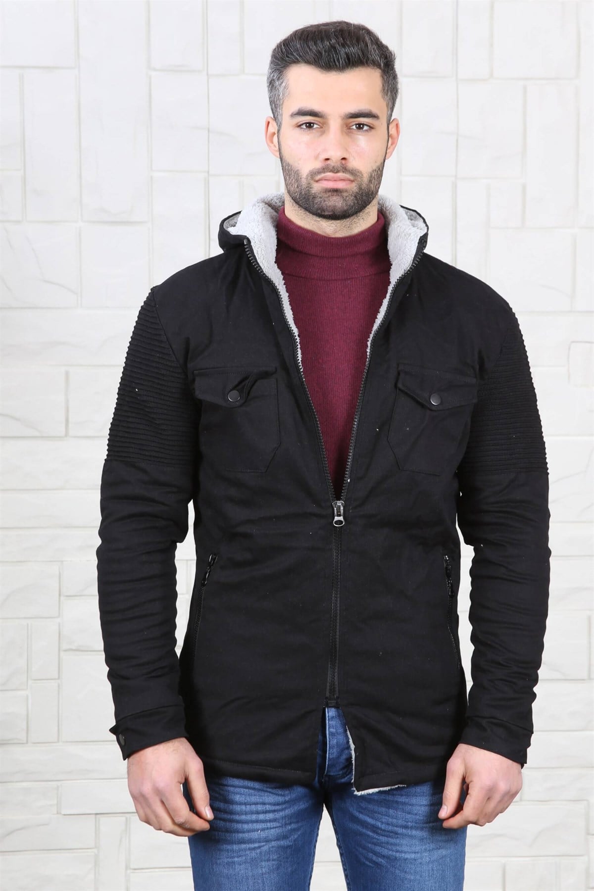 ERKEK SLİM FİT İÇİ KÜRKLÜ KAPŞONLU GABARDİN SİYAH SİYAH