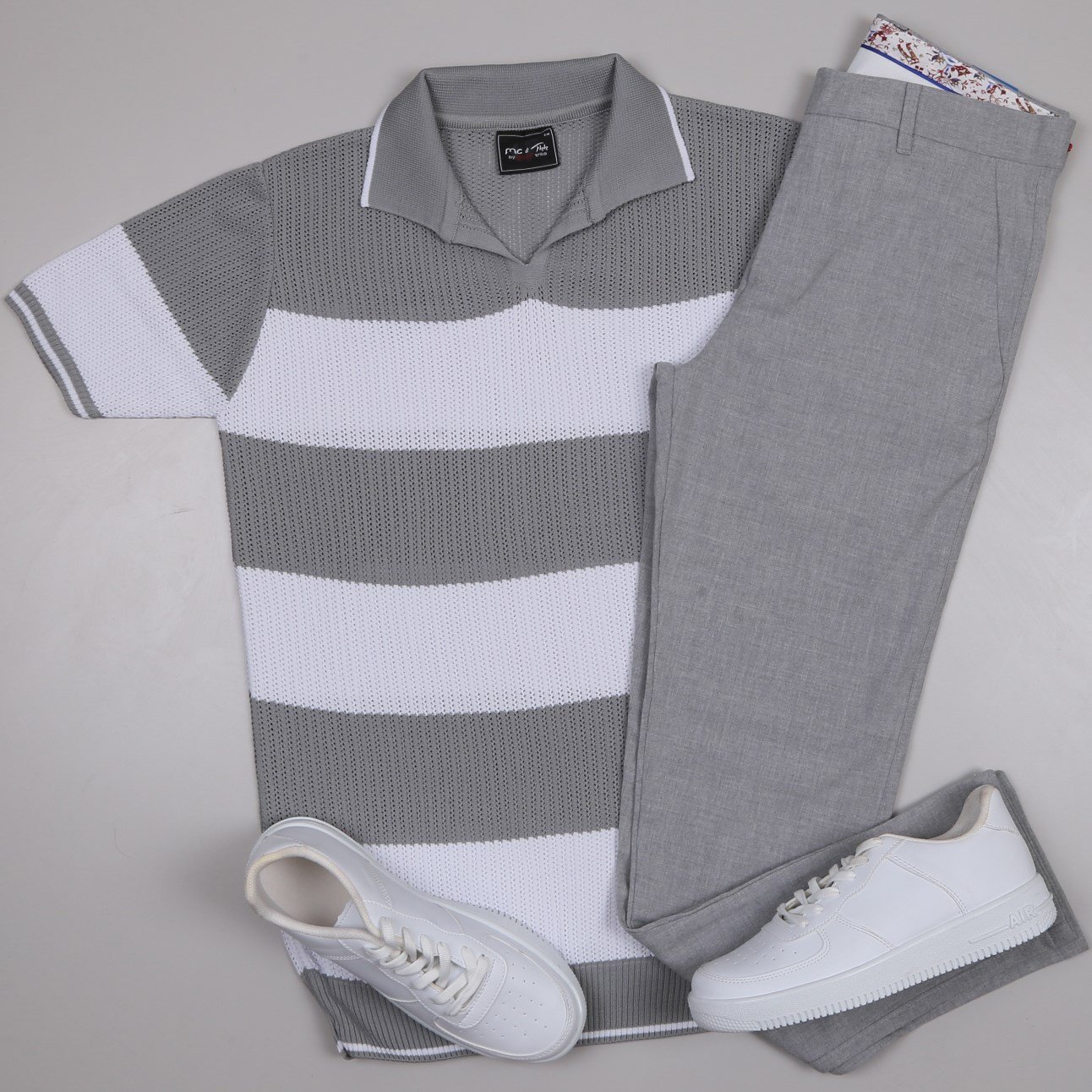 gri çizgili Triko Polo Yaka Tişört gri kumaş  pantolon  ayakkabı Kombin