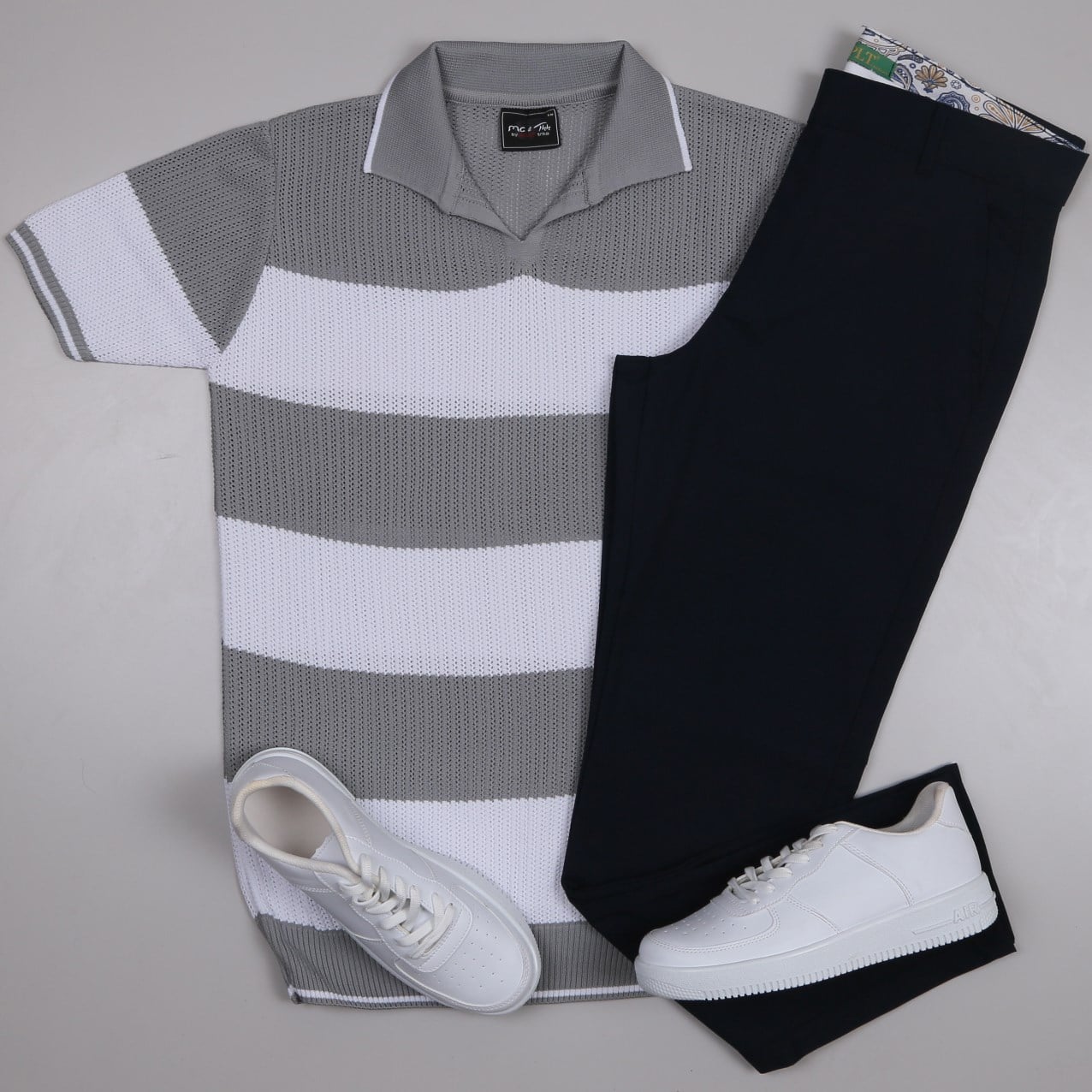 gri çizgili Triko Polo Yaka Tişört lacivert kumaş  pantolon  ayakkabı Kombin