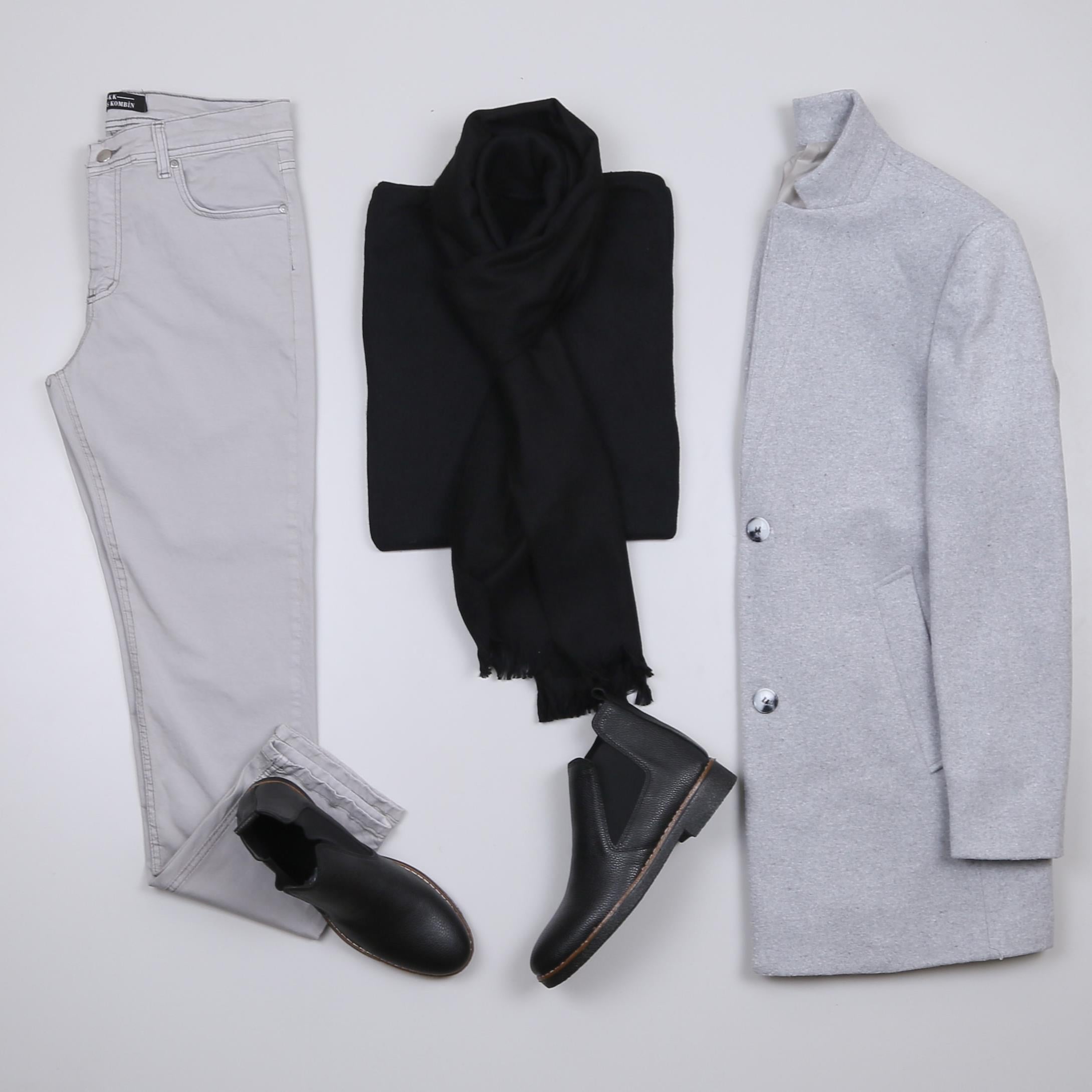 Gri Kaşe Kaban Boğazlı Body Kot Pantolon Bot Kombini