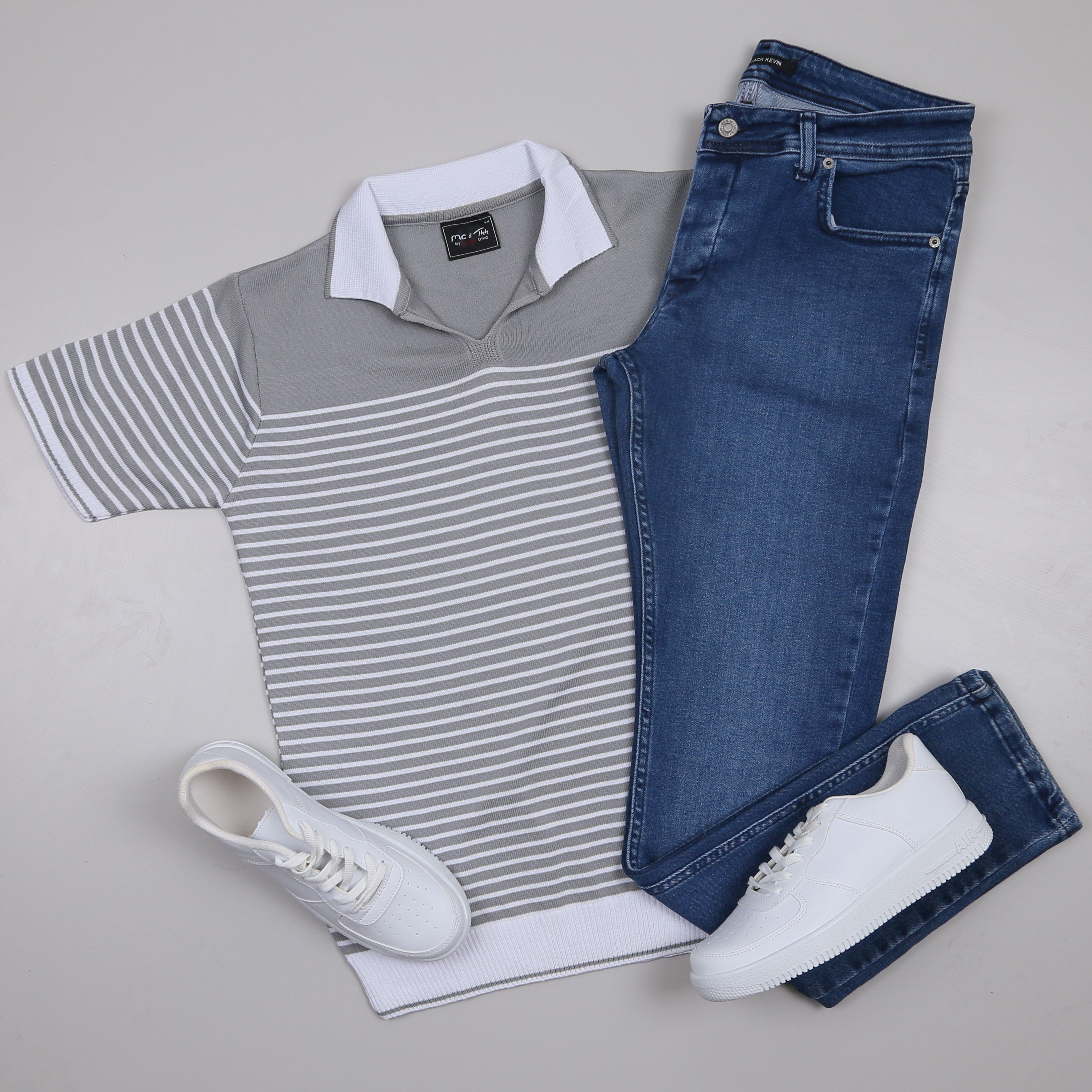 Gri Triko Polo Yaka Tişört Lacivert Pantolon Ayakkabı Kombin