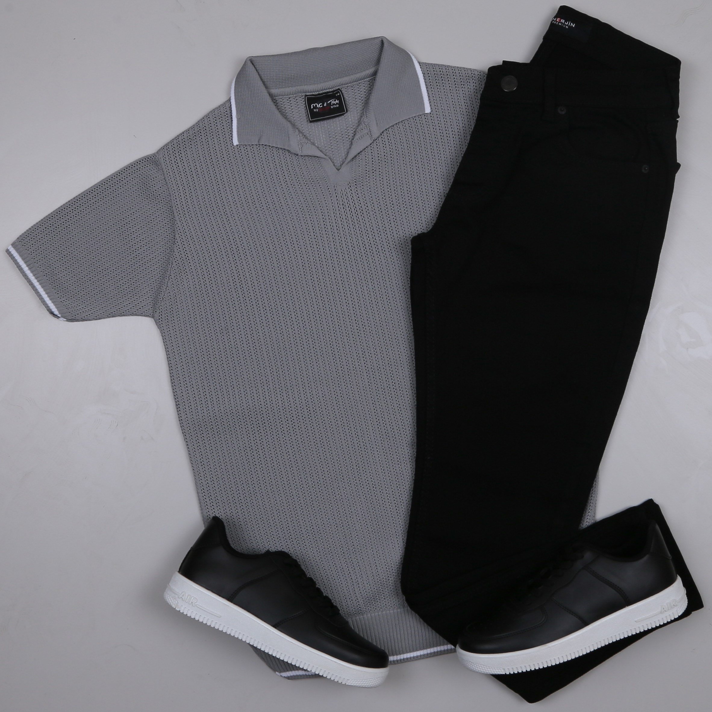 Gri Triko Polo Yaka Tişört pantolon ayakkabı Kombin