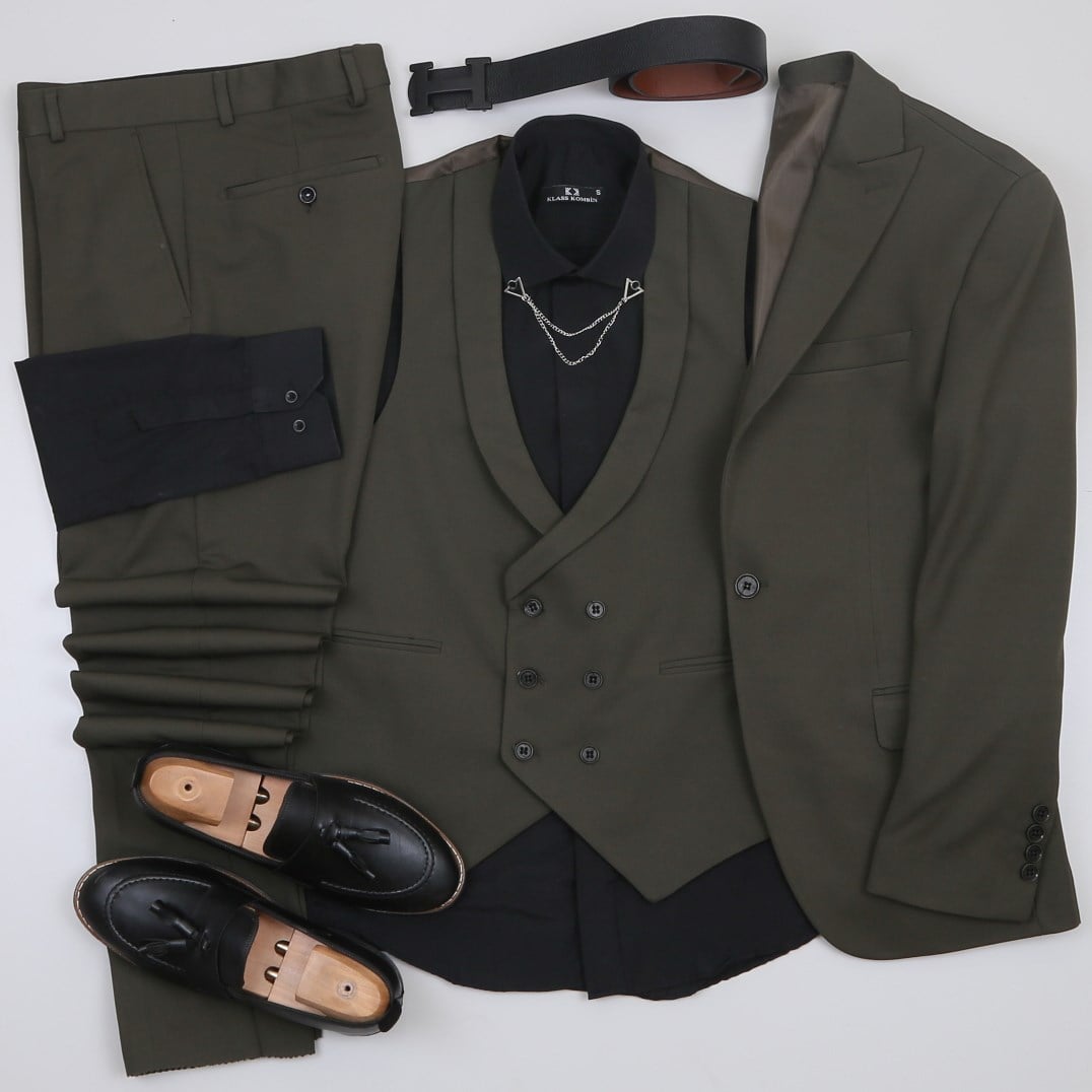 Haki Takım Elbise Siyah Gömlek Kombini
