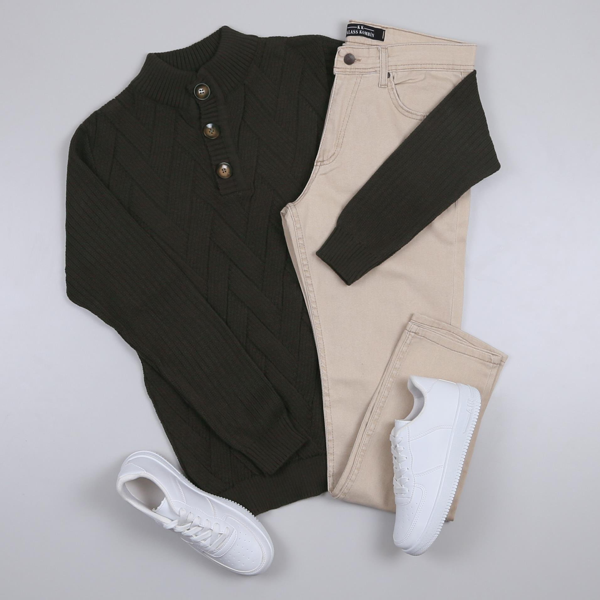 Haki Triko Kazak Kot Pantolon Ayakkabı Kombini