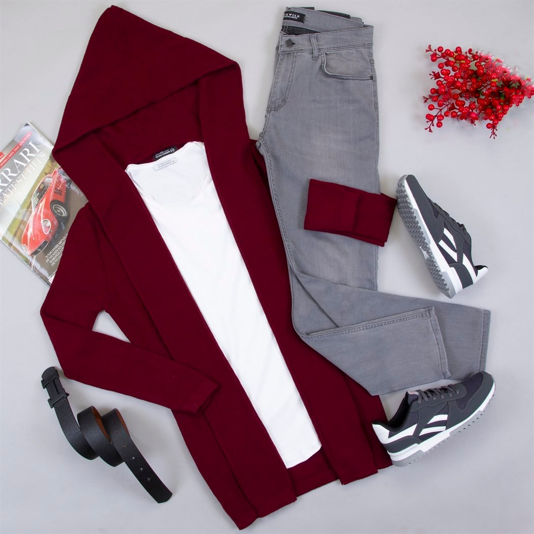 Kapşonlu Bordo Hırka Tişört Pantolon Ayakkabı Kombin