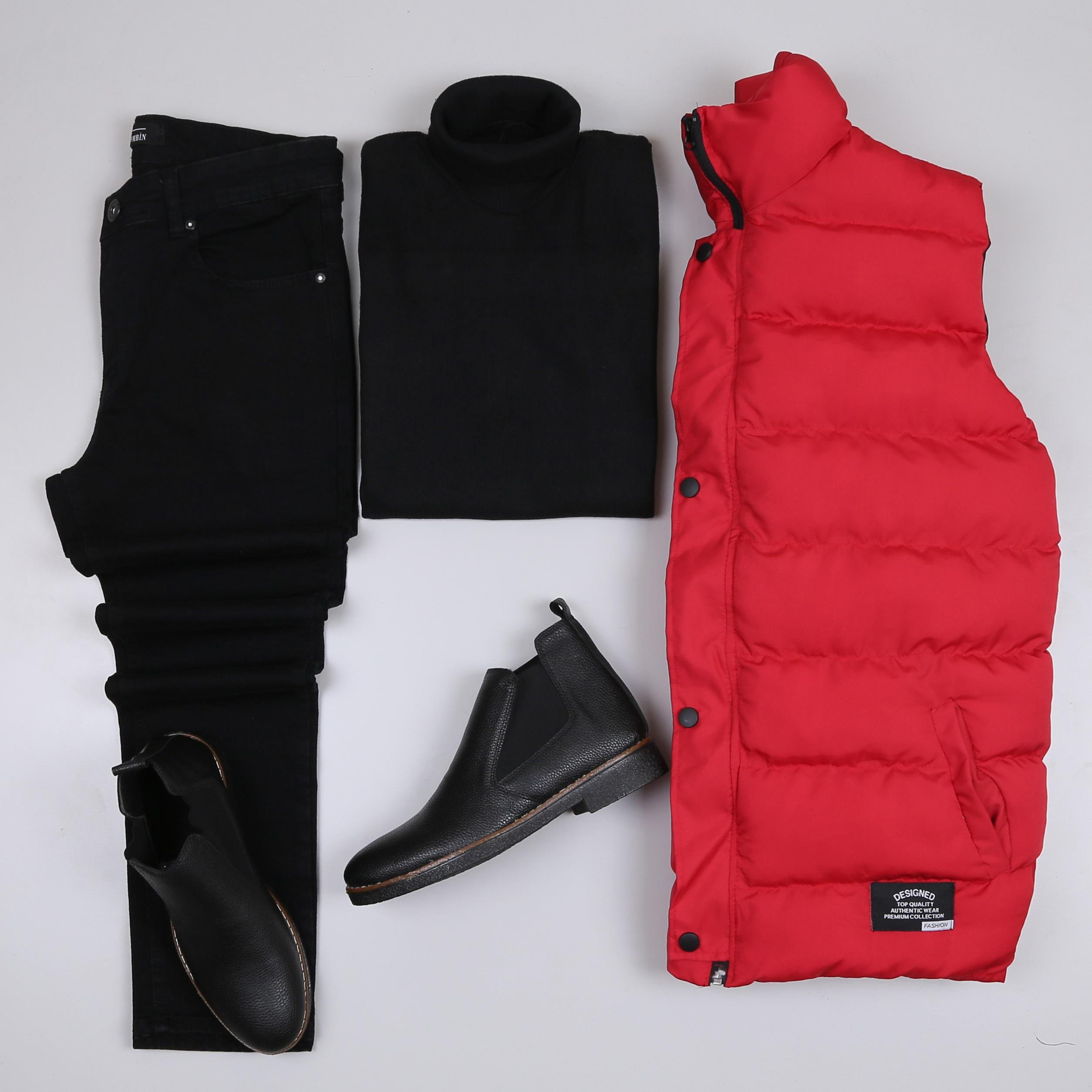 Kırmızı Şişme Yelek Siyah Kot Pantolon Ayakkabı Kombini