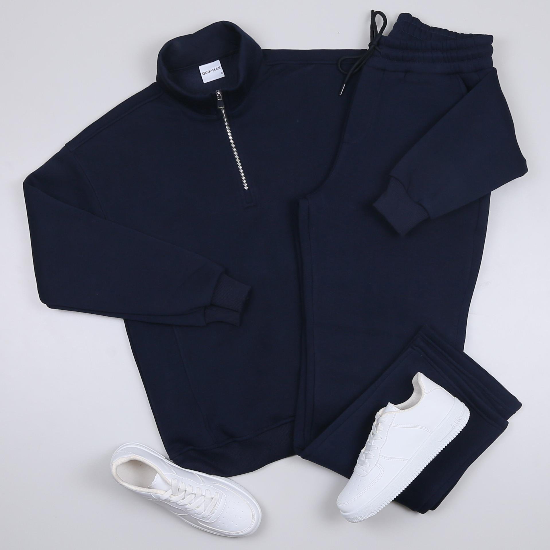 Lacivert Dik Yaka Fermuarlı Sweatshirt Eşofman Altı Ayakkabı Kombini