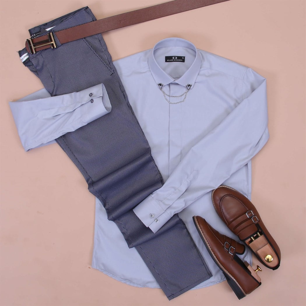 Gri Kumaş Pantolon Gri Gömlek Ayakkabı Kombini