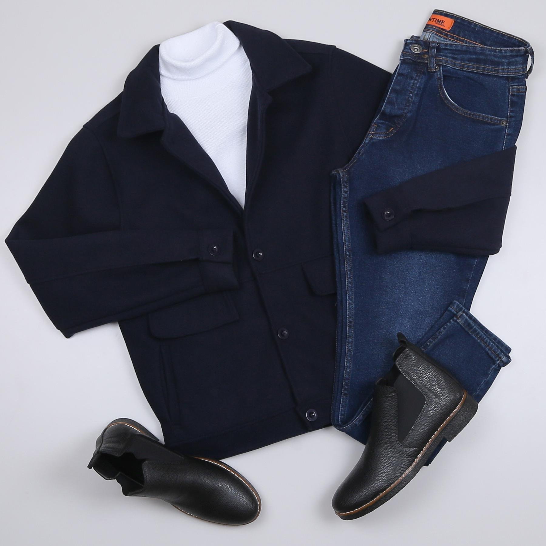 Lacivert Kaşe Ceket Boğazlı Body Kot Pantolon Bot Kombini