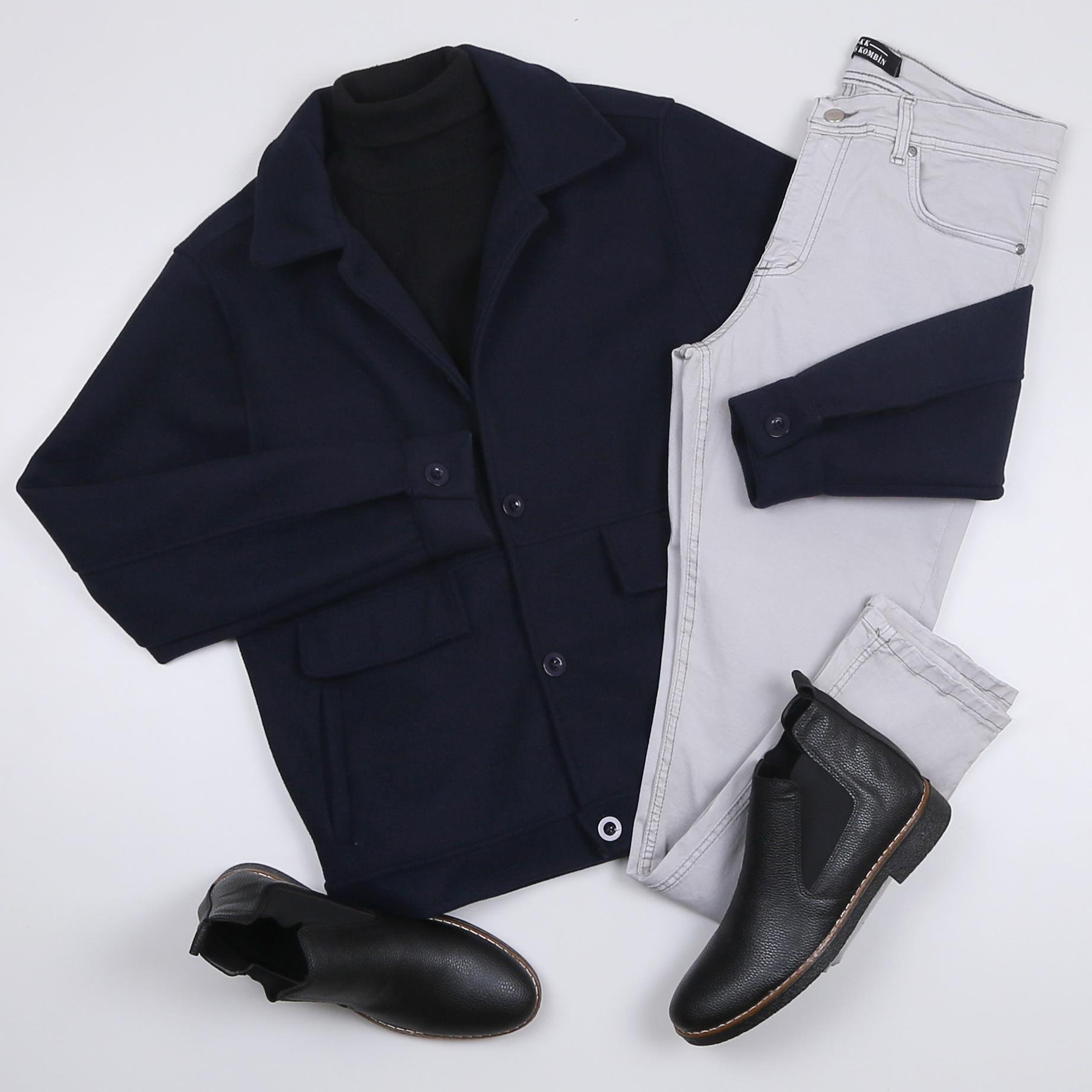 Lacivert Kaşe Ceket Boğazlı Body Kot Pantolon Bot Kombini
