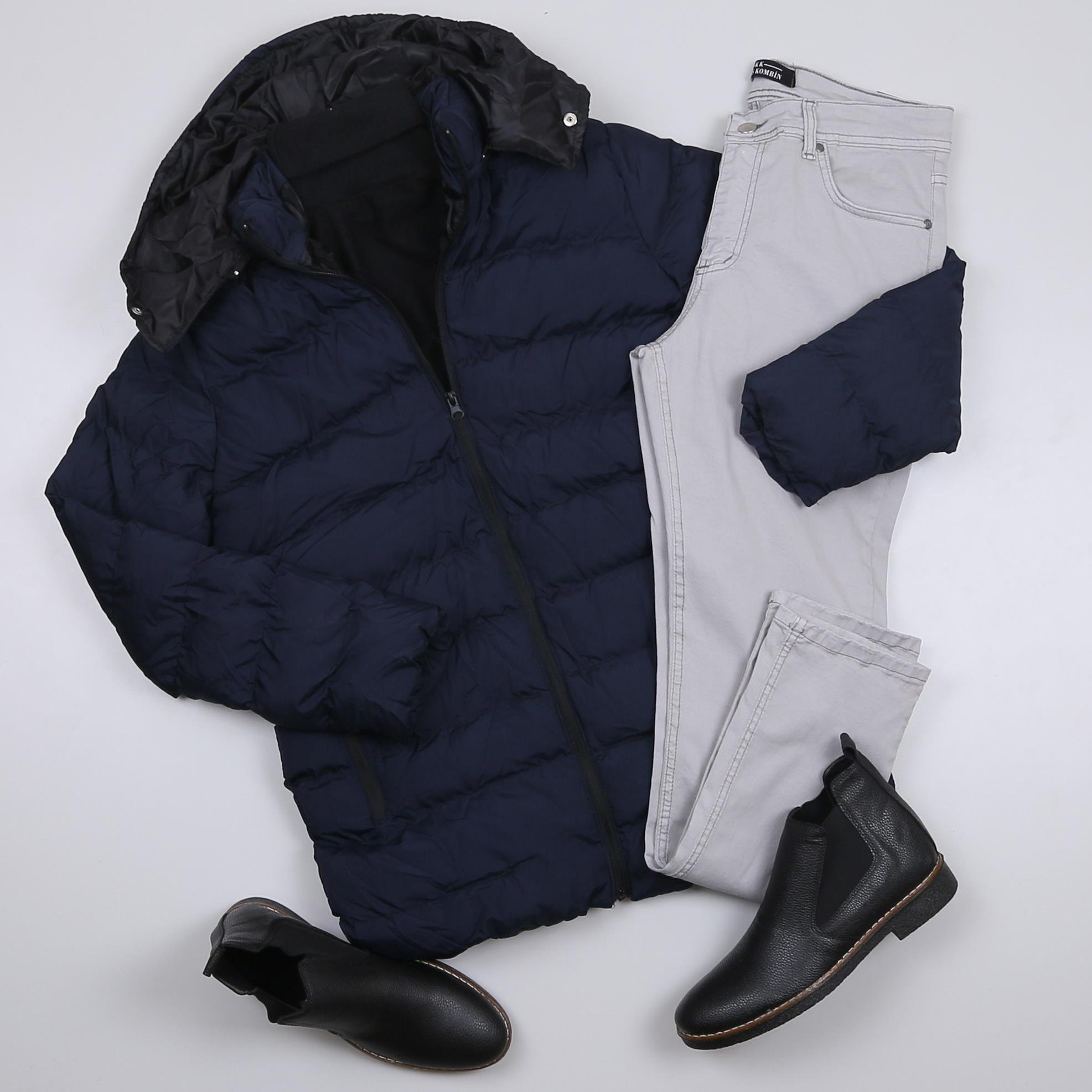 Lacivert Şişme Mont Pantolon Ayakkabı Kombini