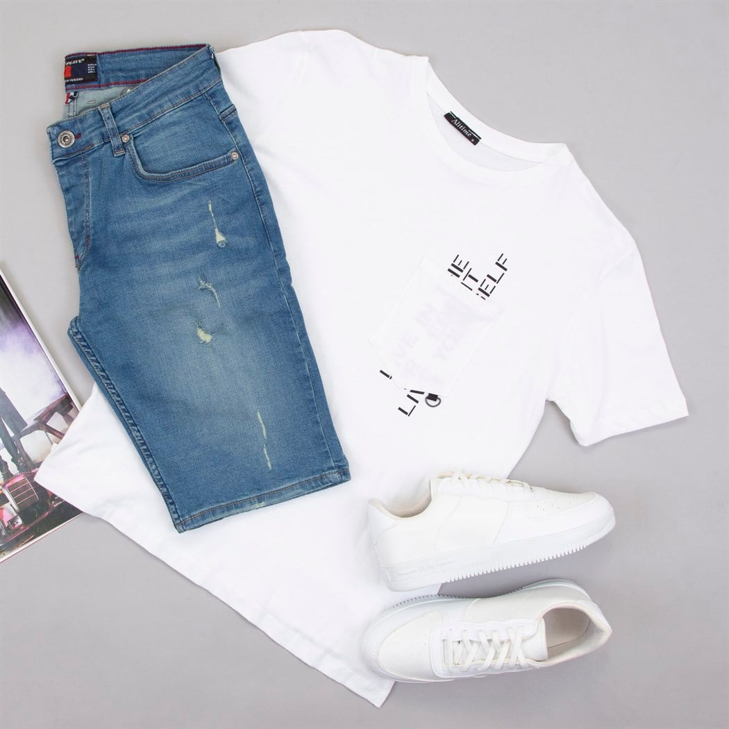 Mavi Kot Şort Tişört Ayakkabı Kombin