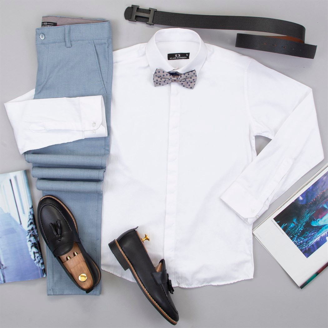 Mavi Pantolon Gömlek Papyon Ayakkabı Kombin