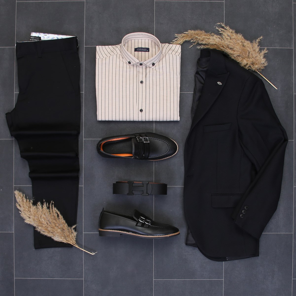 Siyah Ceket Bej Gömlek Pantolon Ayakkabı Kombini