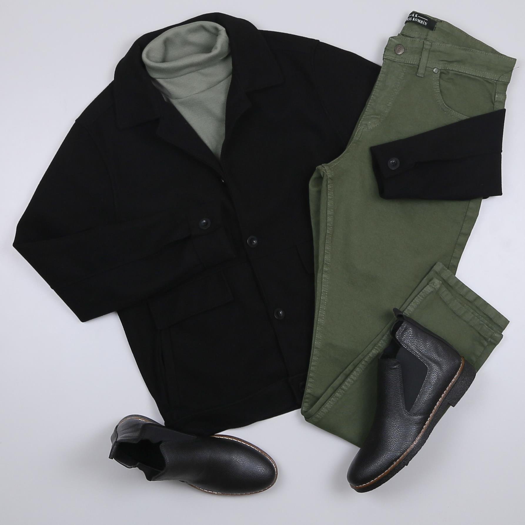 Siyah Kaşe Ceket Boğazlı Body Kot Pantolon Bot Kombini