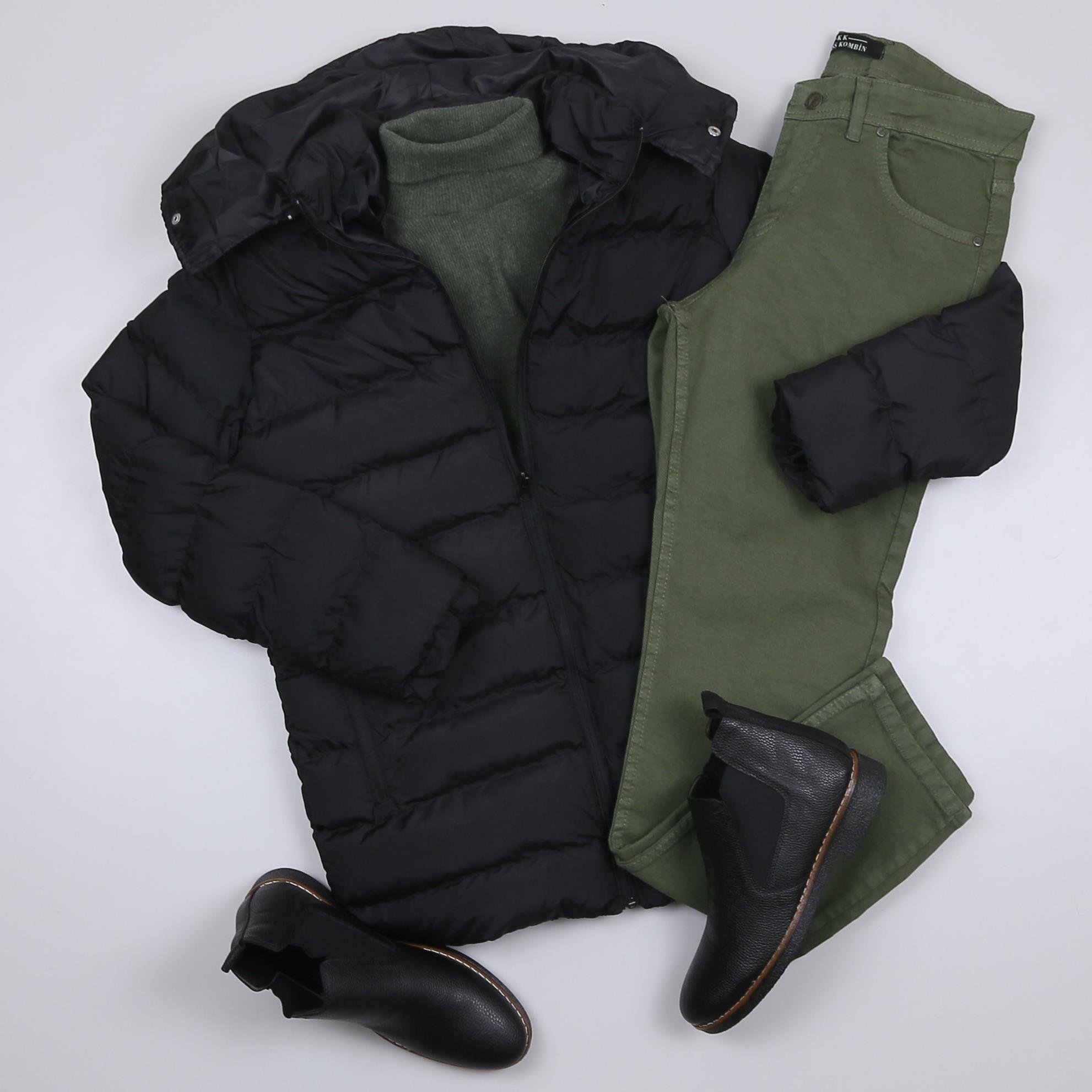Siyah Şişme Mont Boğazlı Body Pantolon Bot Kombini