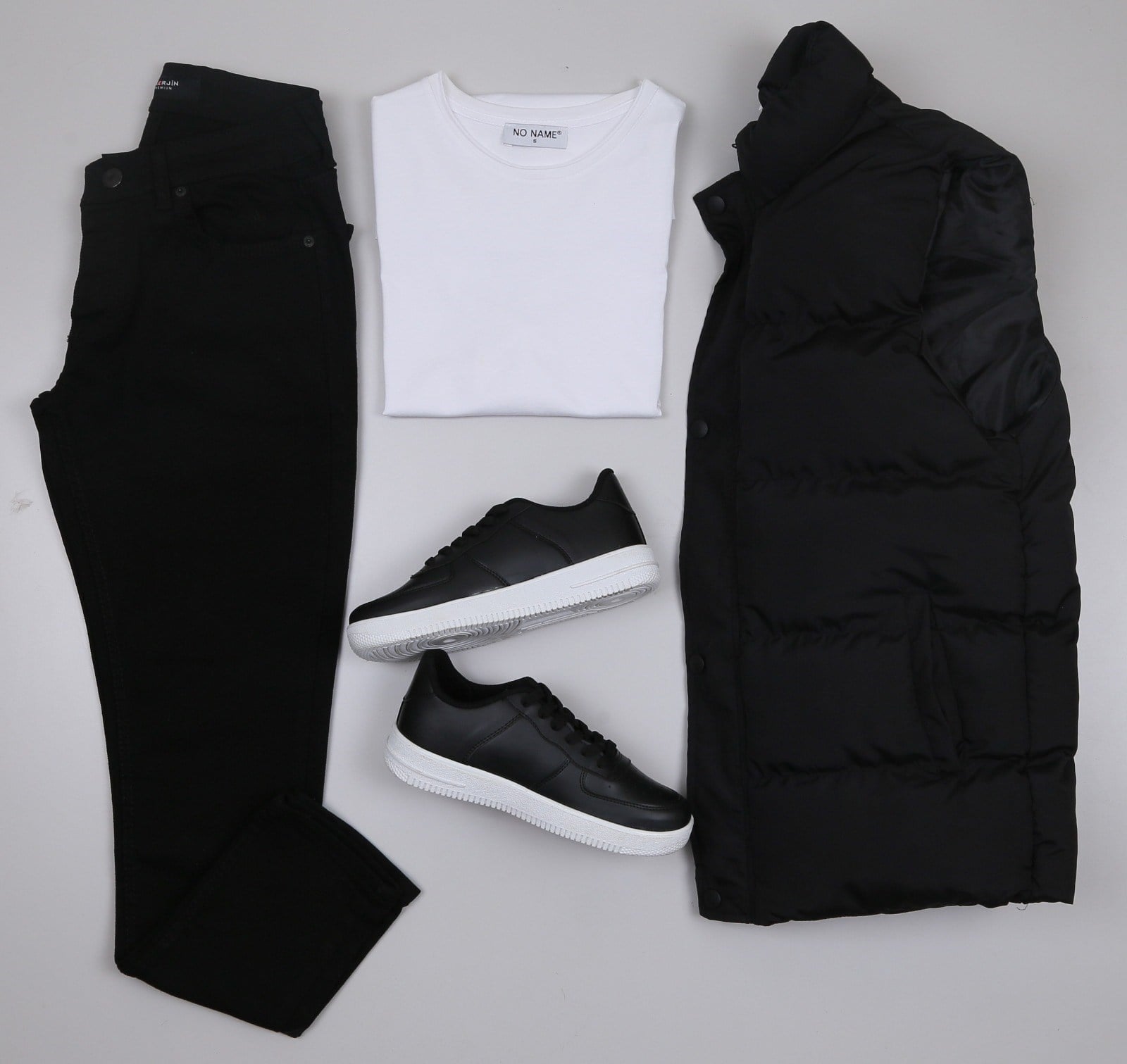 Siyah Şişme Yelek Siyah Kot Pantolon Tişört  Ayakkabı Kombini