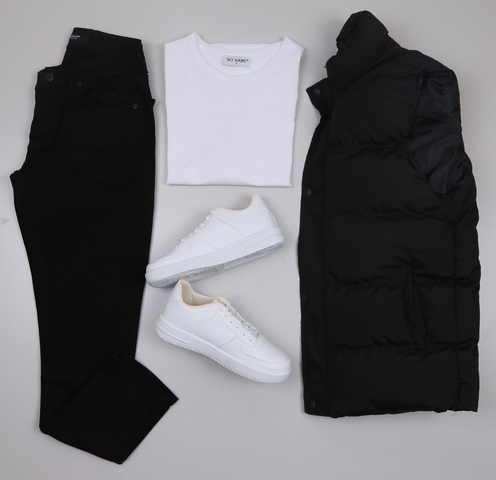 Siyah Şişme Yelek Siyah Kot Pantolon Tişört Beyaz Ayakkabı Kombini